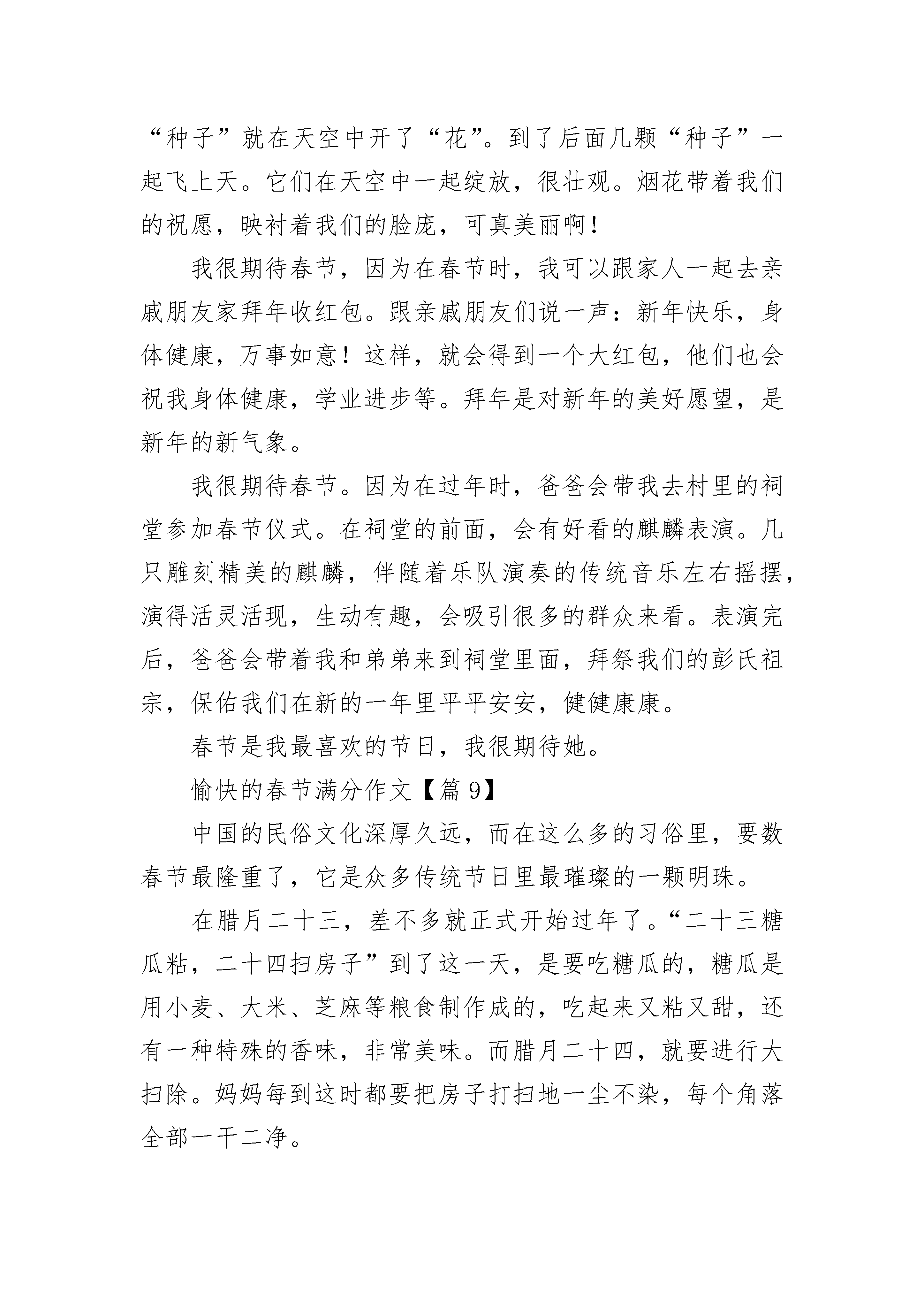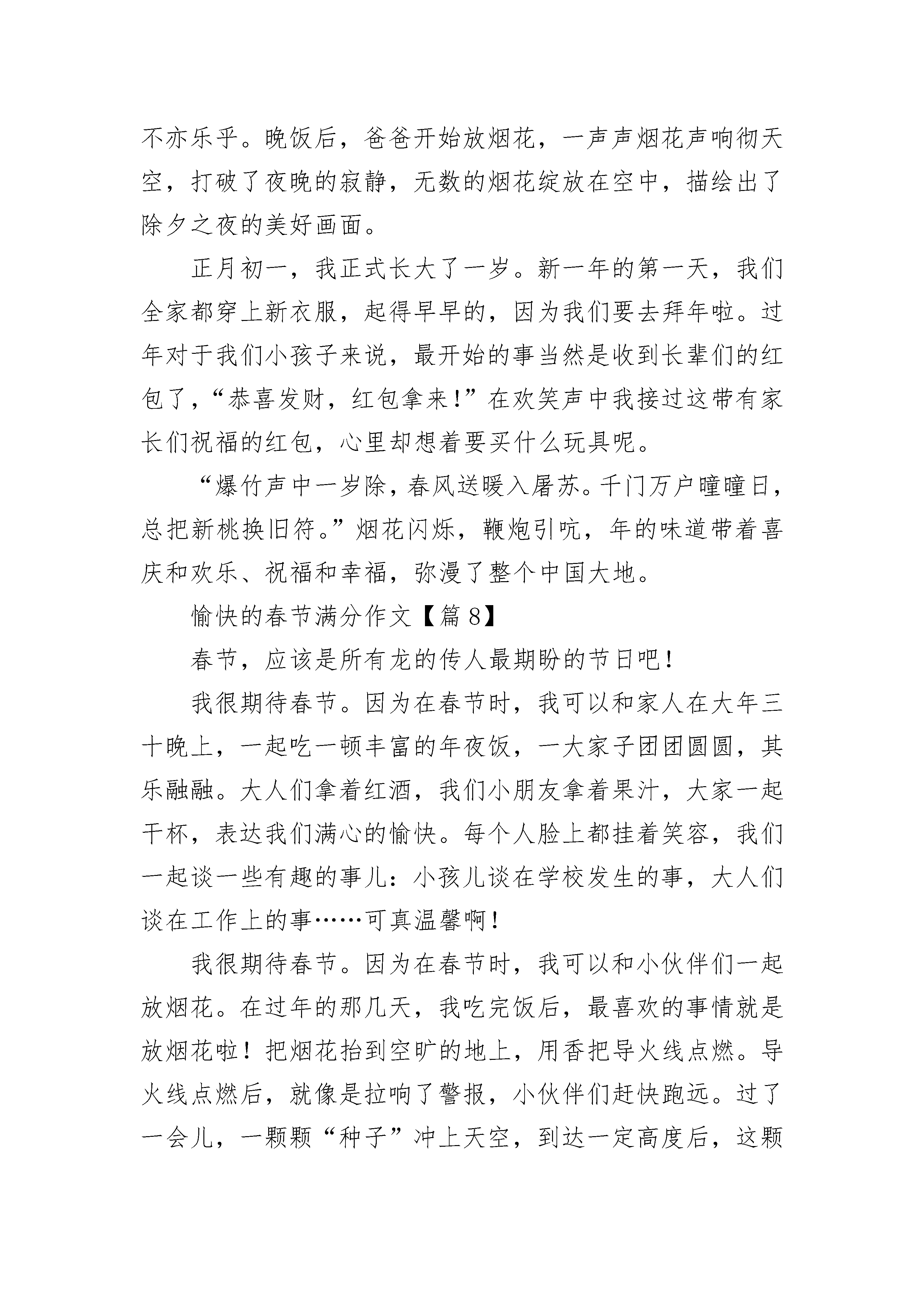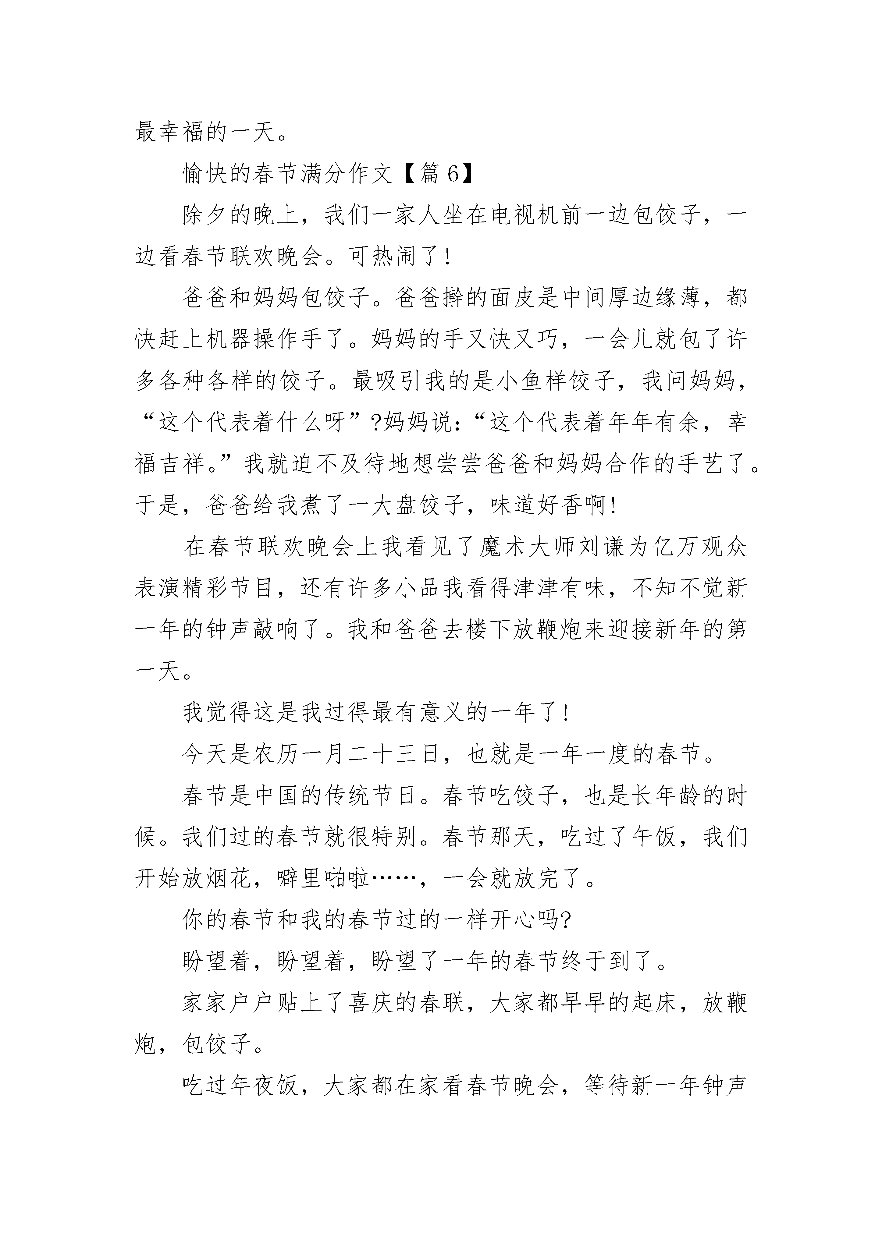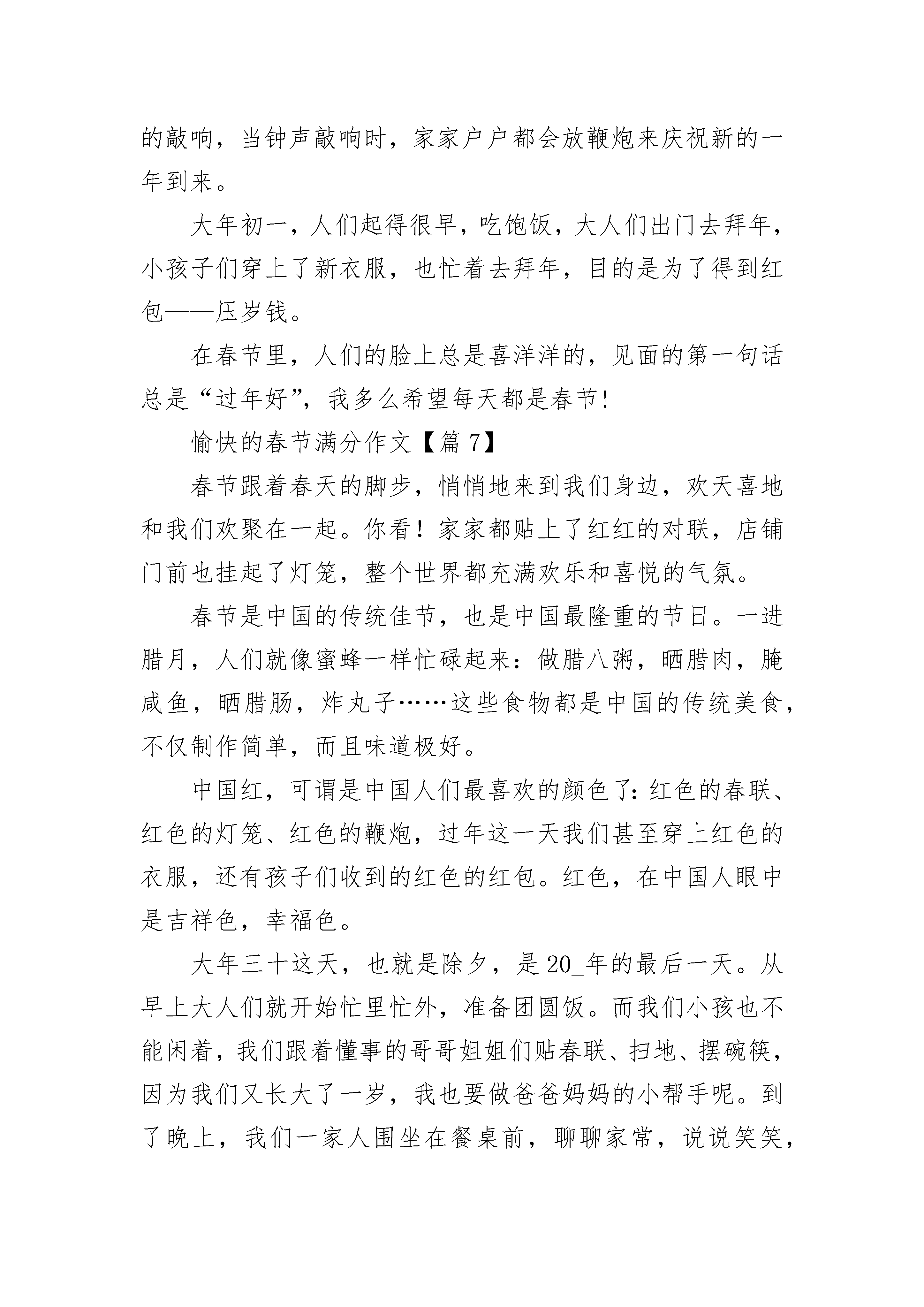 愉快的春节满分作文愉快的春节满分作文最新10篇盼望着,盼望着,一年一度的春节迈着轻盈的脚步向我们走来了。街上热闹非凡,到处洋溢着节日的气氛,人们兴高采烈,家家户户贴春联,下面是小编精心推荐的愉快的春节满分作文,仅供参考,欢迎阅读!愉快的春节满分作文篇1今年春节,我过得非常充实,非常祥和。爷爷今年搬到了新家居住。爷爷说,新房子过年亲人聚得越多越好,因此,咱们一家三口大年三十都赶往金光爷爷家过年,爷爷家过年可热闹啦,爷爷、奶奶、姐姐、哥哥。全来了,加上咱们一家,共有12个人一起过年。大年三十的晚上,20个人围