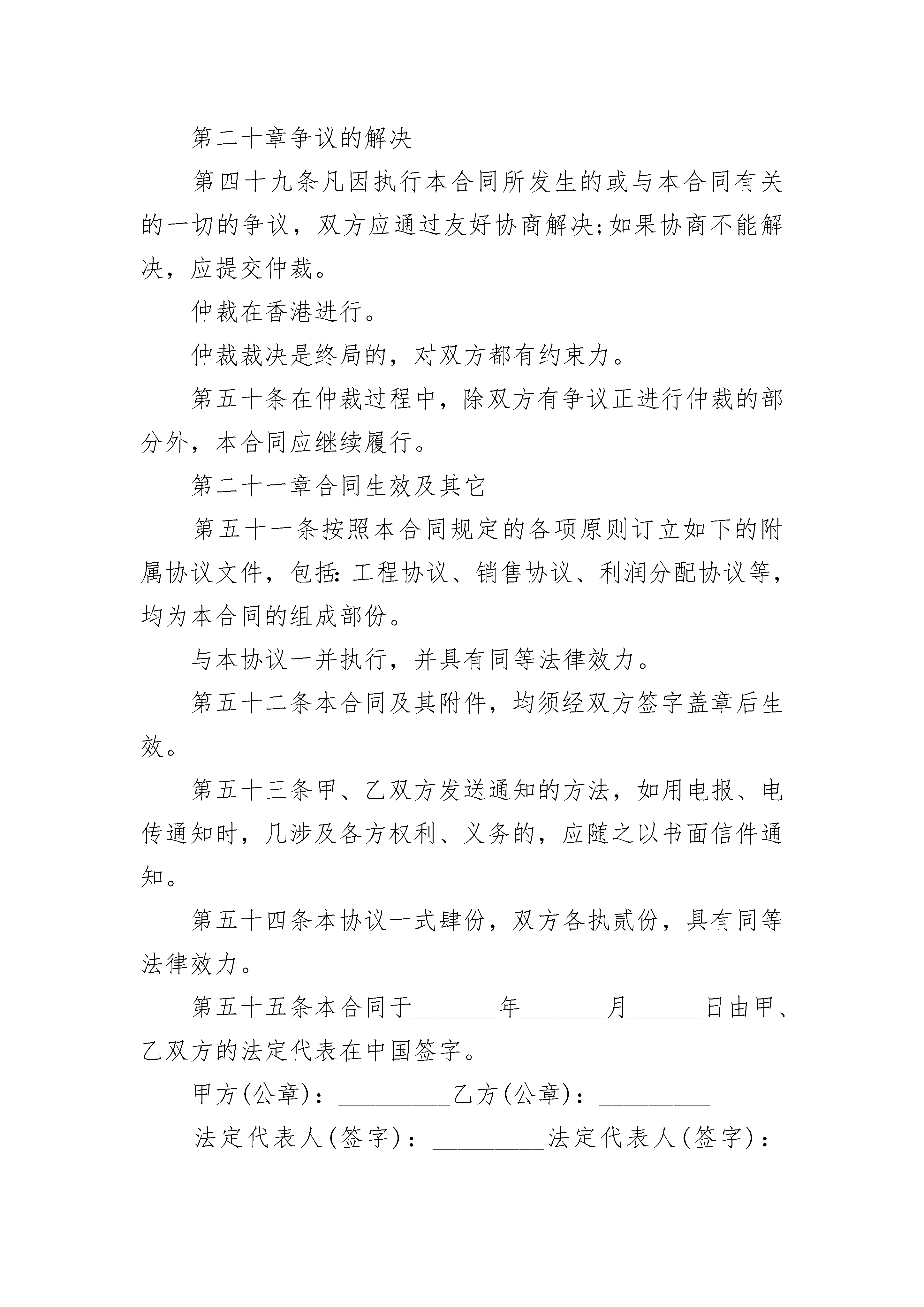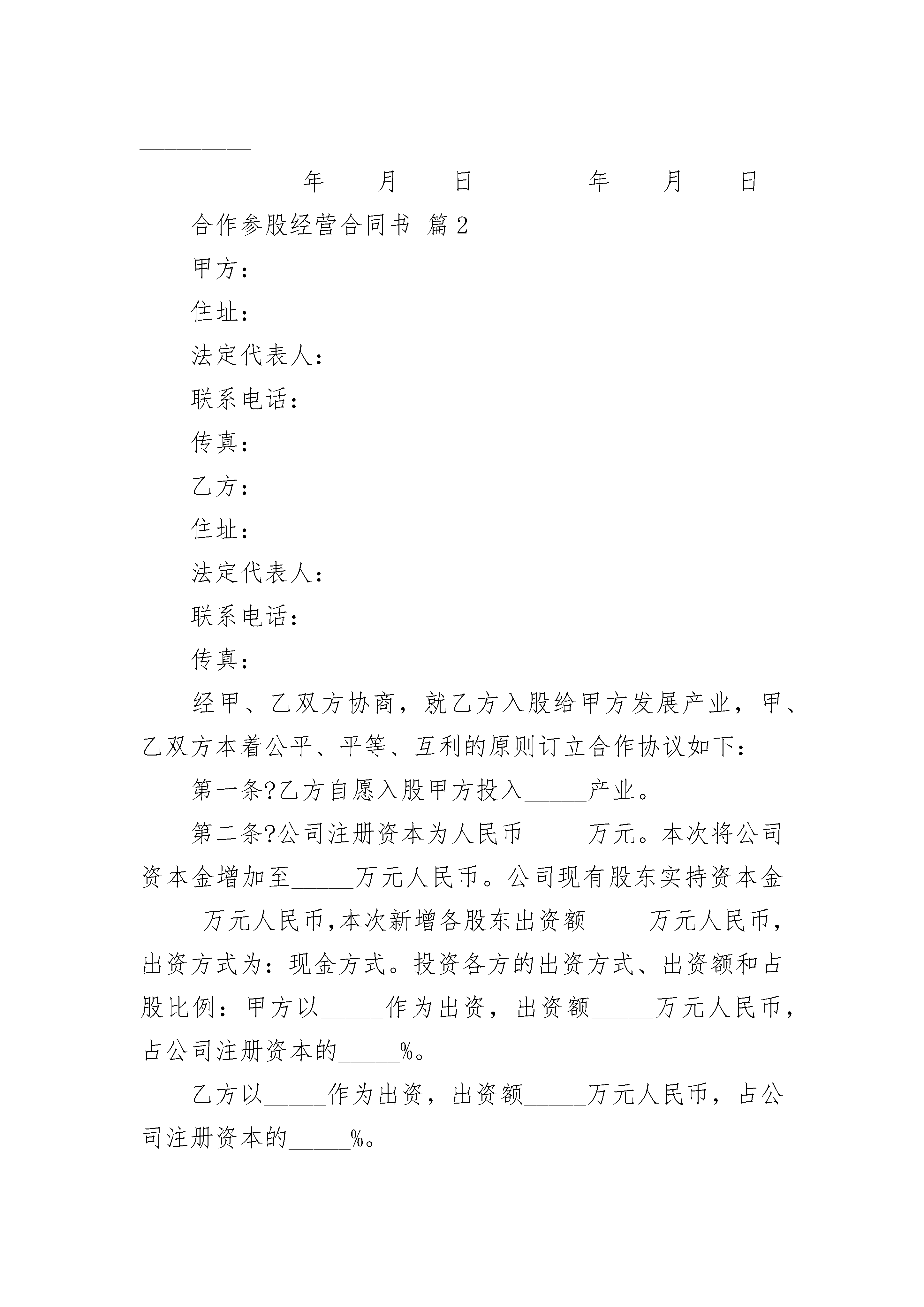 合作参股经营合同书合作参股经营合同书(精选3篇)合作参股经营合同书篇1第一章总则,根据中华人民共和国有关法律、法规的规定,本着平等互利的原则,发挥通过友好协商,同意在中华人民共和国省市,共同举办合作经营企业,特订立本合同。第二章合作各方第一条本合同的各方为:有限公司(以下简称甲方),在登记注册,其法定地址在香港法定代表人姓名:职务:董事长,国籍:。有限公司(以下简称乙方),在中国省市登记注册,其法定地址在,法定代表人:姓名,职务:董事长,国籍:中国。第三章成立合作经营公司第二条甲、乙方根据中华人民共和