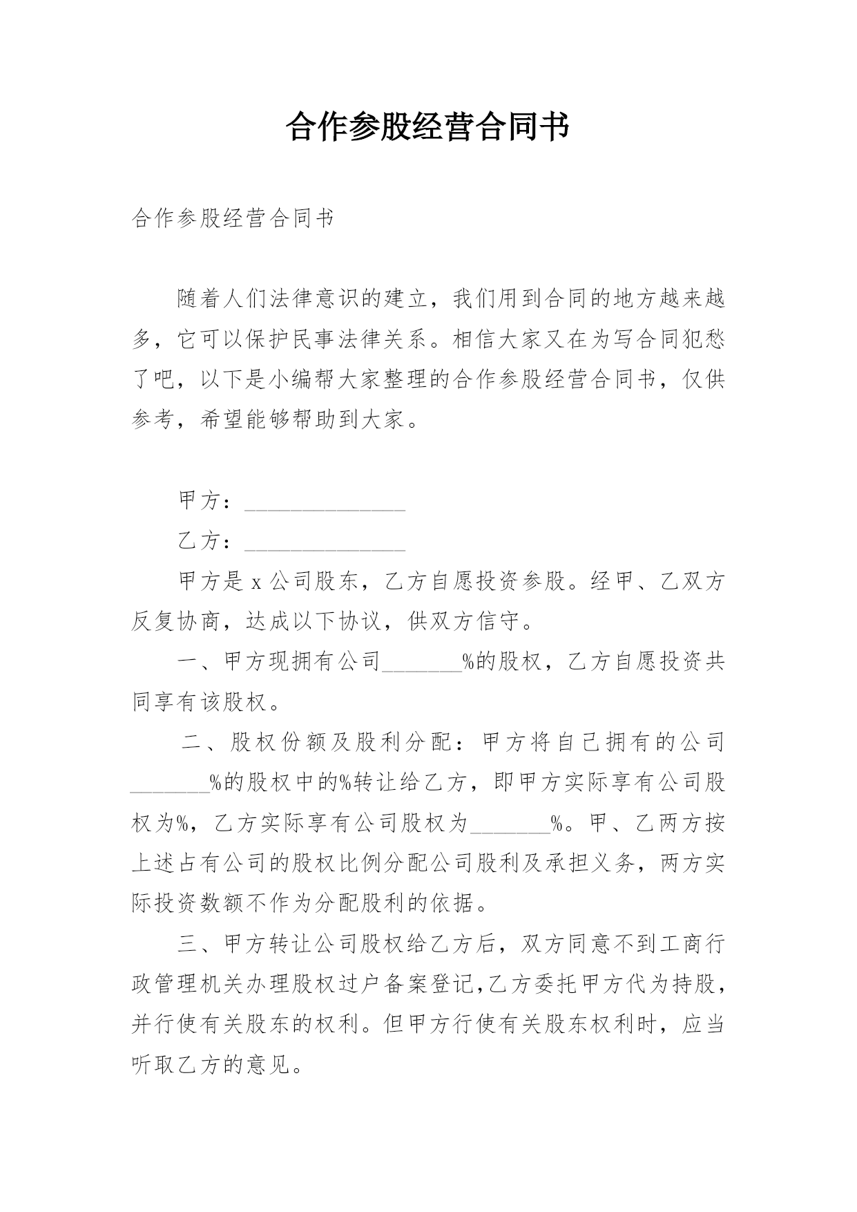 合作参股经营合同书合作参股经营合同书随着人们法律意识的建立,我们用到合同的地方越来越多,它可以保护民事法律关系。相信大家又在为写合同犯愁了吧,以下是小编帮大家整理的合作参股经营合同书,仅供参考,希望能够帮助到大家。甲方:______________乙方:______________甲方是x公司股东,乙方自愿投资参股。经甲、乙双方反复协商,达成以下协议,供双方信守。一、甲方现拥有公司_______%的股权,乙方自愿投资共同享有该股权。二、股权份额及股利分配:甲方将自己拥有的公司_______%的股权中的%转