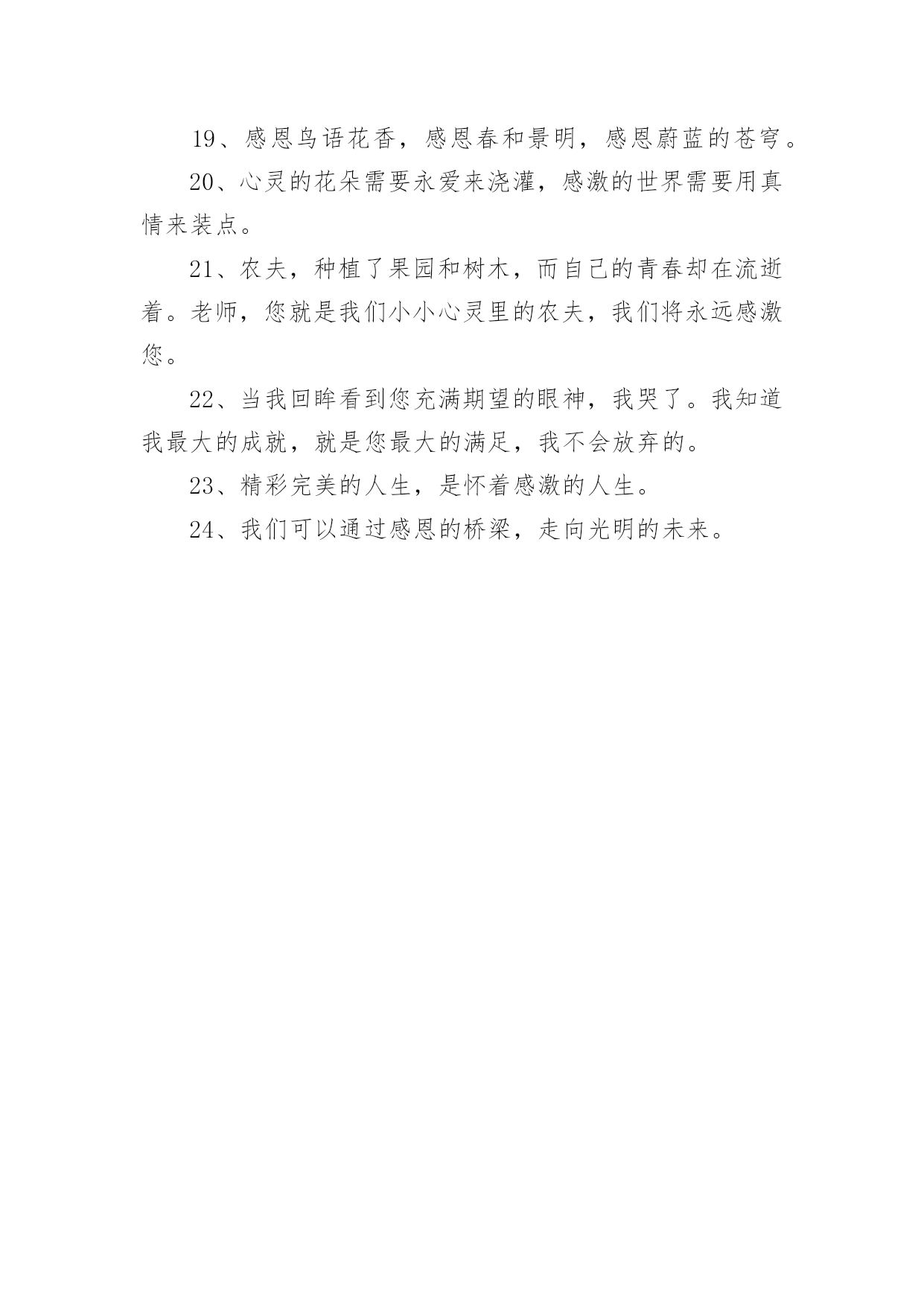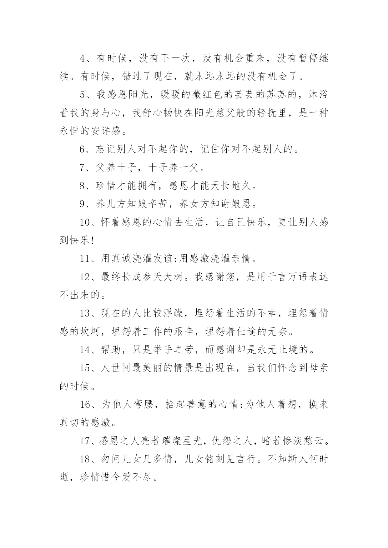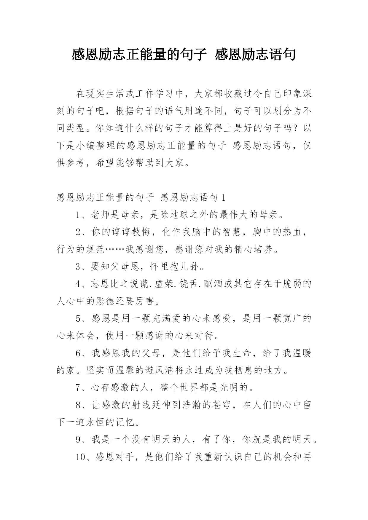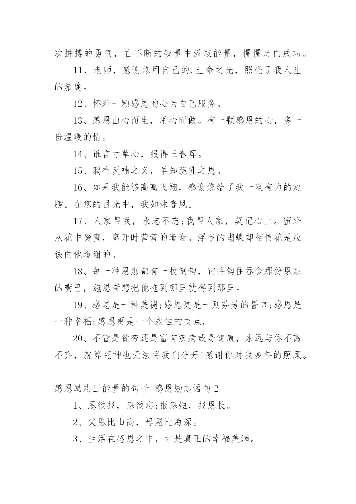 感恩励志正能量的句子感恩励志语句感恩励志正能量的句子感恩励志语句11、老师是母亲,是除地球之外的最伟大的母亲。2、你的谆谆教悔,化作我脑中的智慧,胸中的热血,行为的规范……我感谢您,感谢您对我的精心培养。3、要知父母恩,怀里抱儿孙。4、忘恩比之说谎.虚荣.饶舌.酗酒或其它存在于脆弱的人心中的恶德还要厉害。5、感恩是用一颗充满爱的心来感受,是用一颗宽广的心来体会,使用一颗感谢的心来对待。6、我感恩我的父母,是他们给予我生命,给了我温暖的家。坚实而温馨的避风港将永过成为我栖息的地方。7、心存感激的人,整个世界