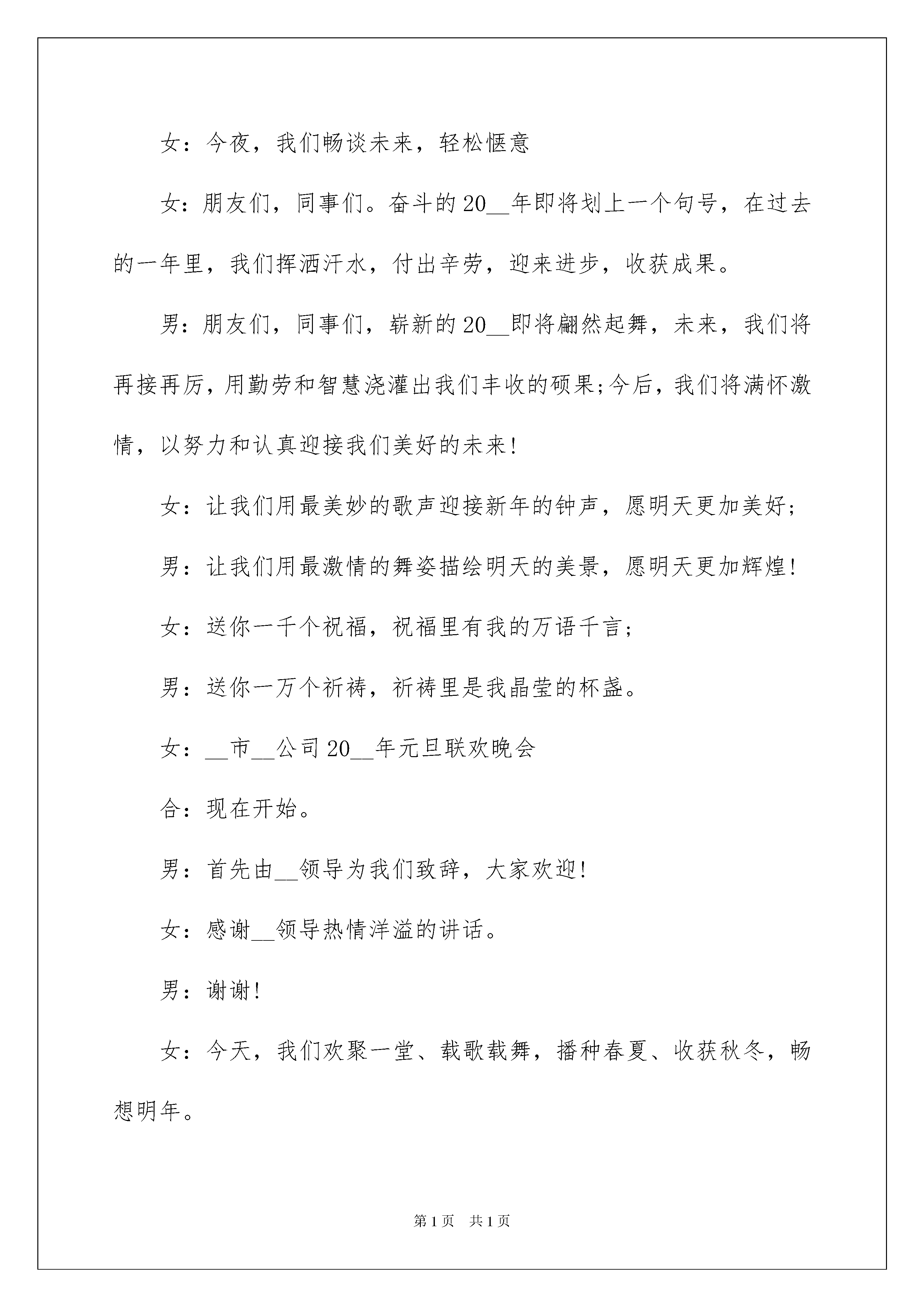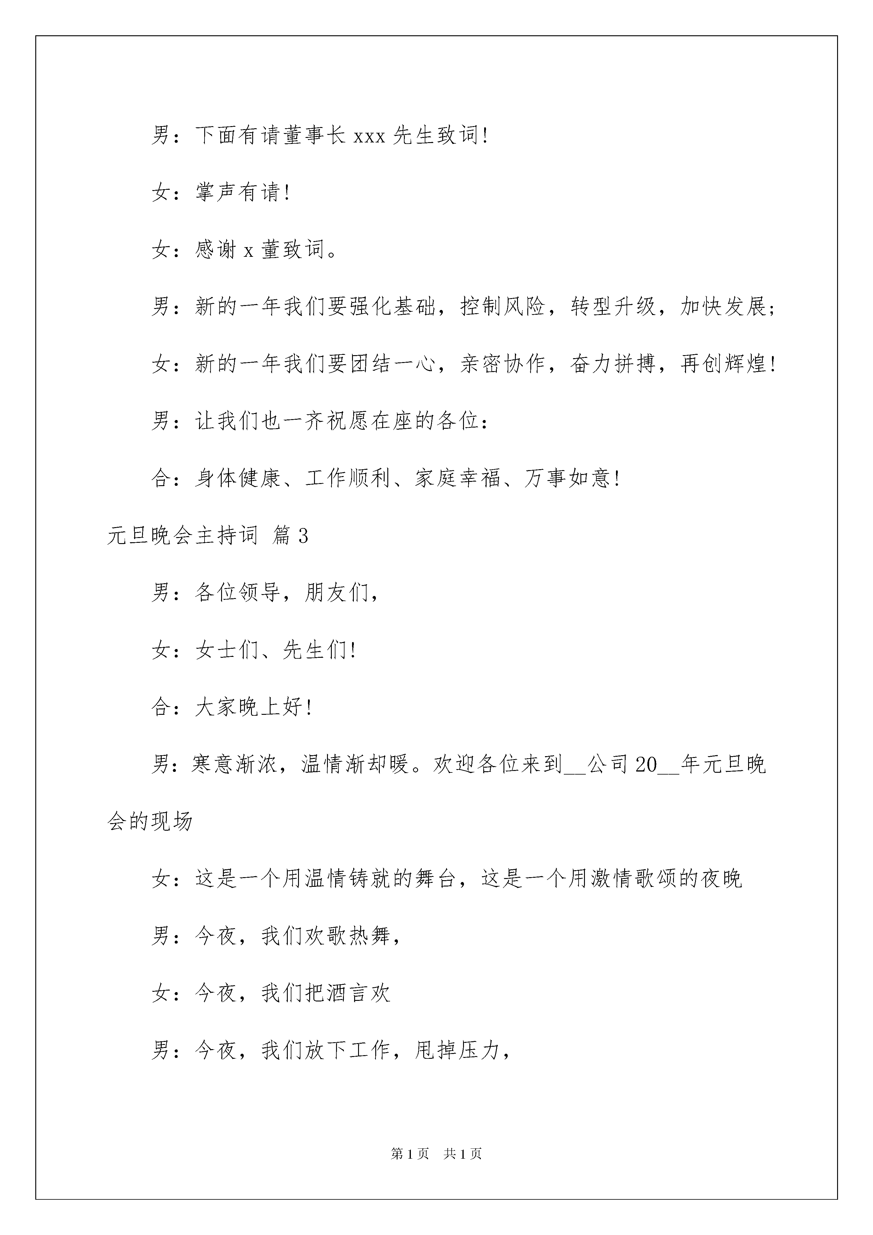 此资料由网络收集而来,如有侵权请告知上传者立即删除。资料共分享,我们负责传递知识。2020元旦晚会主持词范文2020年进入尾声,下面由小编为大家整理的元旦主持词,欢迎大家阅读与借鉴。希望能帮助到大家!2020年元旦晚会主持人台词开场白一:尊敬的各位嘉宾,亲爱的女士先生们,人见人爱的姑娘们以及现场的小朋友们:大家晚上好!今天,我们欢聚在一起,踏着新年宁静的钟声,共同迎来了一个平安、祥和、激情的夜晚,首先我代表酒店的老总及全体员工向您的到来表示热烈的欢迎和衷心的感谢!感谢您在这个特殊的节日里选择与我们一起共度