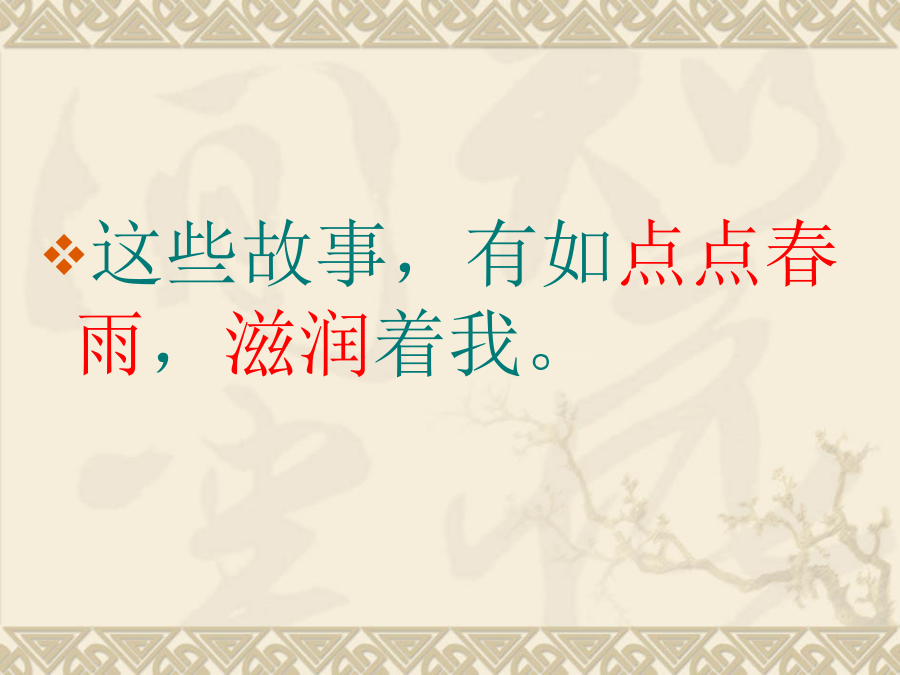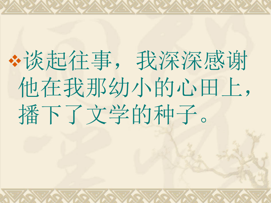 4老师领进门第二课时这些故事,有如点点春雨,滋润着我。我仍然像40年前的小学生那样,恭恭敬敬地向他行礼。谈起往事,我深深感谢田老师在我那幼小的心田里,播下了文学的种子。老人摇摇头,说:“这不过是无心插柳柳成荫。”十年树木,百年树人;插柳之恩,终身难忘!谈起往事,我深深感谢田老师在我那幼小的心田里,播下了文学的种子。“这不过是无心插柳柳成荫。”插柳之恩,终身难忘!小资料:朱德给老师让座1959年,朱德同志在云南政治学校礼堂看戏,开演前,一位年逾古稀的老人由服务员引了进来,朱德一眼便认出,那位老人是自己早年在
