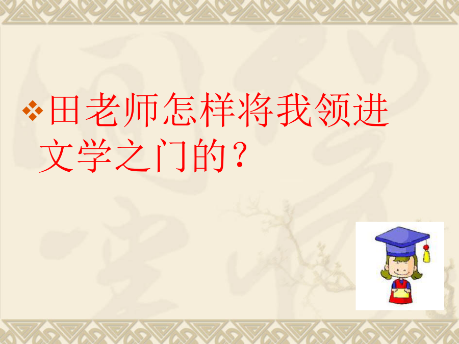 老师领进门修行在自身修行在个人老师领进门读一读,认一认读一读,记一记__老师领————进门谈起往事,我深深感谢他在我那幼小的心田上,播下了文学的种子。田老师怎样将我领进文学之门的?我听得入了迷,恍如身临其境。田老师戛然而止,我却仍在发呆,直到同桌捅了我一下,我才惊醒。这些故事,有如点点春雨,滋润着我。