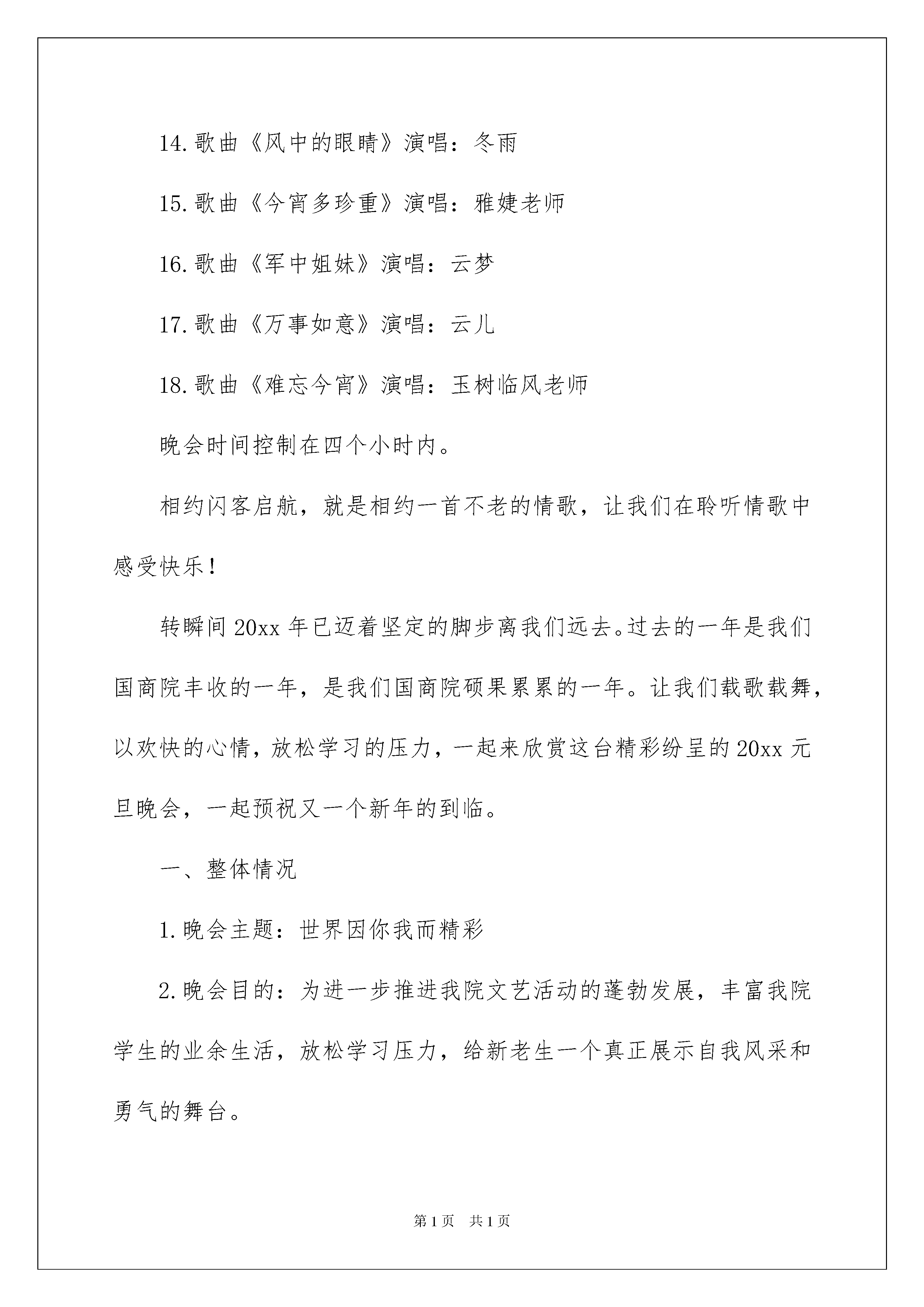 2022元旦活动计划汇编九篇元旦活动计划汇编九篇时间过得真快,总在不经意间流逝,相信大家对即将到来的工作生活满心期待吧!一起对今后的学习做个计划吧。计划怎么写才能发挥它最大的作用呢?下面是我为大家整理的元旦活动计划9篇,仅供参考,希望能够帮助到大家。元旦活动计划篇1新年伊始,万象更新。20xx年元旦即将到来,在这辞旧迎新之际,为了缓解大家的工作压力,过一个有意义、轻松愉快的节日,经院党政工讨论决定,元旦前夕举办“迎新年庆元旦经管学院教职工户外行活动”。一、活动时间20xx年12月30日下午14:30--xx:00。二、活动路线学院办公大楼(起点)---→农科大楼---→西门西湖(合影)---→榉树广场---→四季广场---→外专公寓---→学院新办公楼---→东门喷泉广场(合影)---→科研楼(北侧)---→学院办公大楼(终点)注:全程4公里,时间约1小时30分钟三、活动要求1.参加人员为全院教职员工。2.本次活动为集体活动,要求全院教职工,统一行动,服从指挥,按规定线路行进,按统一要求停留,按规定时间完成,严禁脱离集体擅自行动。3.参加活动人员在当日14:10到学院办公楼前(起点)集合、签到并领取活动帽,14:30在两名旗手的带领下,统一出发。4.本次活动将在学院办公楼前、西门西湖广场、外专公寓、东门喷泉广场设置4个签到点,参与者须按规定线路和时间完成全程。5.本次活动是为集体徒步健身活动,参与者不得驾驶、乘坐、骑行交通工具。6.请各工会小组长按通知要求,组织本组会员积极参加。四、奖励办法凡按通知要求、按规定线路和规定时间完成全程者,可在终点领取活动纪念品一份。五、注意事项1.全体参加人员,请穿运动鞋;活动开始前做一些身体拉伸等预备活动,特别是脚踝和膝关节要活动开,避免受伤。2.按时参加活动,注意保暖,用水自备。3.本次活动旨在欣赏校园、拥抱自然、锻炼身体、健康生活,重在参与,安全第一。4.本次活动倡导文明、环保、绿色、健康,请不要乱丢烟头、垃圾等杂物。元旦活动计划篇2活动目标:1.知道新的一年即将来到,萌发参与庆祝活动的兴趣和欲望。2.能积极参与庆祝活动,通过表演节目、做游戏,体验庆祝活动的快乐。3.增进父母与孩子,同伴之间的情感交流,加强家园联系。活动准备:1.布置教室:挂灯笼、气球和幼儿制作的吊饰。2.布置表演布幕:用气球、幼儿手工作品装饰。3.准备表演活动的材料:歌曲mp3、服装、头饰等。4.准备游戏材料:布条、萝卜标志、皮球2个。活动过程:1.教师讲话,激发幼儿参与庆祝活动的兴趣。2.幼儿表演节目(1)大合唱:《新年好》(2)舞蹈:《健康歌》(妃)(3)儿歌朗诵:《信的旅行》《摇篮》(女孩)(4)古诗朗诵:《一去二三里》《夜宿山寺》(男孩)(5)歌表演:《秋妈妈和果娃娃》3.集体音乐游戏:《幸福拍手歌》(新版)4.亲子游戏(1)萝卜蹲(10人)准备:各色标志10对(即时贴萝卜,妃)(2)找妈妈(11人)准备:遮眼睛的布条11条(3)运西瓜接力赛(26人)准备:大皮球2个元旦活动计划篇3一、主题:喜迎元旦,开心快乐,气氛活泼,发扬闪客启航团结向上的特点。二、创意阐述1、特色统一性:这是在xx老师和同学组织下的一台元旦联欢晚会。在新的一年里,迎新老朋友作为一种极具亲和力的交流方式。节目形式不限,歌曲,朗读,乐器演奏,戏曲等均纳为主题,内容清新向上。2、加强互动性:以节目单为主,也就是说:先报上固定的节目和表演者,由策划组委会排定先后顺序。固定节目报名方式:在本帖回复,报名时报上节目(含内容)和表演者名单,用的名字必须要和晚会的名一样,不能更改报名,报名截止到29日止。特聘两个固定节目《好日子》《难忘今宵》的演唱者。3、扩大参与性:邀请一些知名人士参加,比如:对闪客启航作出杰出贡献的老师,班组长。跟闪客启航有密切关系的友人,也就是特邀嘉宾。4、丰富欣赏性:参与节目者和节目单要经过严密的审核。固定节目数量控制在15-20个。三、晚会流程★晚会时间:20xx年元月1日晚上20;00---0:00★晚会地点:xxx两个固定不变节目:《新年好》《难忘今宵》《新年好》在开场宣布晚会开始后由嘉宾来演唱。《难忘今宵》在晚会结束语前由嘉宾来演唱。晚会的几点说明和注意事项:晚会开始前由舞清影班长宣布晚会注意事项1:为保证晚会整场效果,请所有演职人员7:30分点前进入晚会现场并试好自己的麦。晚会期间一律不予试麦。2:为使晚会有一个良好的运行效果,请大家尽量使用聊天室“悄悄话”功能(包括献花,打字聊天。)3:请尊重他人也尊重自己,在演职人员及佳宾拿麦说话唱歌的时候,请主动关好您自己的麦。