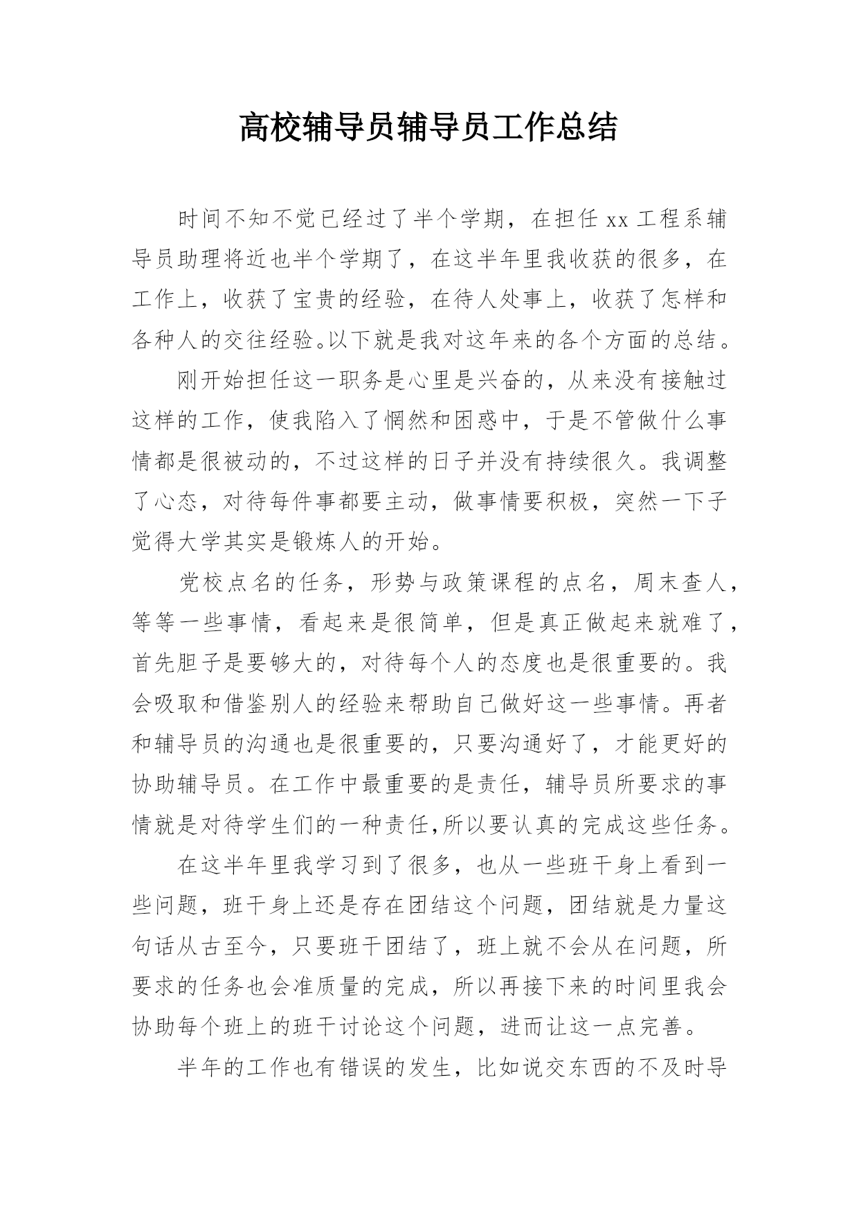 此资料由网络收集而来如有侵权请告知上传者立即删除。资料共分享我们负责传递知识。高校辅导员辅导员工作总结作为高校开展大学生思想政治教育工作的骨干力量高校辅导员在高校扮演着十分重要的角色研究高校辅导员队伍建设对于加强高校思想政治教育工作有着重要的意义。今天小编给大家整理了高校辅导员辅导员工作总结希望对大家有所帮助。高校辅导员辅导员工作总结范文一时间不知不觉已经过了半个学期在担任xx工程系辅导员助理将近也半个学期了在这半年里我收获的很多在工作上收获了宝贵的经验在待人处事上收获了怎样和各种人的交往经验。以