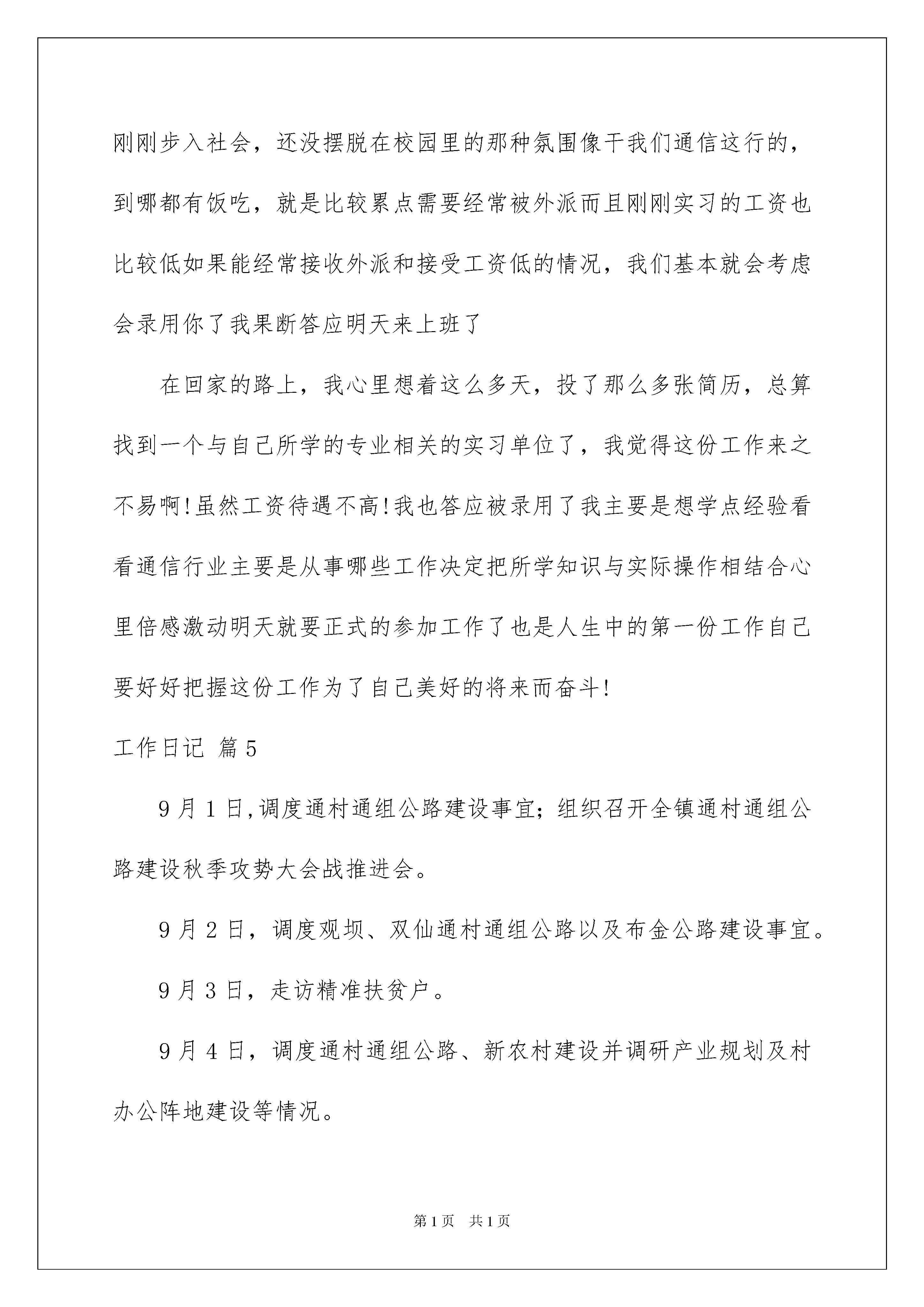 2022工作日记模板汇总5篇工作日记模板汇总5篇时间过得真快,一天又将结束了,相信大家都有不少体会吧,想必是时候写一篇日记了。那么日记有什么格式呢?下面是我精心整理的工作日记5篇,希望对大家有所帮助。工作日记篇1师傅连续两天帮我介绍了有关城市光网的知识,让我收获良多。本来我想在学习一些知识以外还能亲自动手,来做一些师傅平时做的工作,但是由于我不是电信正式员工,而我所处的部门有些资料是不能给我接触的,此外,这些工作需要很高的准确性,所以我最终只能在旁边看着他们工作。总的来讲,今天电话不是很多,所以我也有时间和那些学长学姐聊一些有关大四的安排。学长和学姐基本上都告诉我要充实自己的实践能力,毕竟课本上的东西都是很死板的,要真正的运用到现实中还是需要一些实践经验的。此外到了大四要学会合理安排时间,应为临近毕业,我们要开始着手自己的毕业设计,同时还要开始为自己的工作做打算。所以这对我们自己我控制能力的要求将提高很多。虽然今天在专业知识上没有什么提高,但是确是也是有意义的一天。工作日记篇2**月23日,我和同事们一道进村入户开展“挂包帮”、“转走访”精准扶贫攻坚工作。我们在天星镇双河村与村“三委”班子成员一道学习传达贯彻落实中央、省、市、县开展精准扶贫工作会议精神,听取了村支书***扶贫工作汇报,研究了部门挂钩扶贫工作。在谈到村里的困难时,蒋支书对我们说,双河村有17个村民小组,767户2928人。虽然全村贫困面大,但是我们有信心通过多方努力,在20xx年全面实现建档立卡贫困户468户1594人脱贫出列。村里存在的主要困难是群众增收难,居住环境差、生活不宽裕。公共基础设施薄弱、产业发展滞后,无户间作业路硬化到家家户户,村组公路晴通雨阻现象突出。特别是一些边远高寒的地方,当地群众生产生活、居住生存环境条件十分差,房屋破烂、生活简陋,急需异地搬迁转移安置。听完蒋支书的情况介绍后,我们一行6人从村委会出发,踏着泥泞小道、爬坡上坎,走访扶贫对象72户。下晚返回到村委会休整,明天还将继续进村走访扶贫对象。9月24日,从早8时开始进村入户,到晚18时45分,我们一行6人终于完成了每人12户扶贫对象的调查摸底和访问任务,平安返回县城。一大早,雨下个不停,仿佛为我们洗尘。心里惦记着住在山一家、水一家的乡亲们,我们继续冒雨进入双河村营头、团山自然村,走进贫困农户家中完成昨天未走访完的任务。走在滑溜溜、坑坑洼洼的泥巴路上,坚定的.脚印浅一脚深两脚的通向远方的家。走进村民家中,老乡们把我们视亲人般递水让座。我们同乡亲们拉着家常、讲解扶贫政策,用笔记录生产、生活困难情况,用相机见证一瓦一房一家人的境况。秋雨也不一直下了,汗水也不一股脑流了,大家心里都暖暖的。那天大的困难也一下子让微笑着的精气神赶跑了。中午,我们走访到双河村监督委员**8老人家。75高龄的赵老也是团山自然村老社长,一位在当地德高望重的老人,一位老百姓心中的贴心人。精神矍铄的赵老告诉我们,他当了32年的社长,为村民们发展生产、生活做了一些力所能尽的事,获得了一些荣誉。看着墙上的荣誉牌,赵老喜滋滋告诉我们,这是20xx年12月天星镇党委、政府首届“十佳道德模范”评选给他的“敬业奉献模范”先进个人奖牌。同行的蒋贵强村支书介绍说:老社长没读过两天书,也不是共产党员,但他思想先进、热爱集体、爱学习,处事公道、为人正派,敢说敢想敢做,乡亲们都佩服他、敬重他。村里大小事都听他的意见和安排。前年,团山公路有一段路被山洪冲毁,急需要恢复,村委会帮助解决了5吨水泥,老社长硬是发动了100余名村民,花了两天时间,自力更生把近100米的损毁路面打成了水泥路,这段路至今都保持了顺畅通车。蒋支书还给我们介绍说:今年,老社长动员发展了村里有志青年罗国文成为团山社的第一个养殖大户。我们随后走访进入***家,参观了他今年新修的养猪场。***介绍说:他年初投入了50余万元资金,喂养了100余头猪,长势良好,猪价也看好。在谈到今后打算时,他期盼帮扶资金支持,通过联户经营、群众入股、订单收购等方式带动周围乡里乡亲发展生猪养殖,逐步壮大养殖规模,为大家脱贫致富尽一份力。下午,我们来到在9月17日被近300方危石阻断村组公路的排危作业现场(该路断位于双河村委会老街安置点去榨房自然村20余米入口处),因下雨路滑推车溅了一身泥的蒋支书指着工人正在破碎的石头对我们说:9月14日,我们接到村民险情报告,当天就组织人员安全转移了涉及危险威胁的5户18人。同时还在在公路两头加设了防护栏和安全警示牌。这几天,虽然天天都是秋雨,险断边坡还不时有石头、泥土滚落,但是我们采取了有效措施、险情处置及时,险情