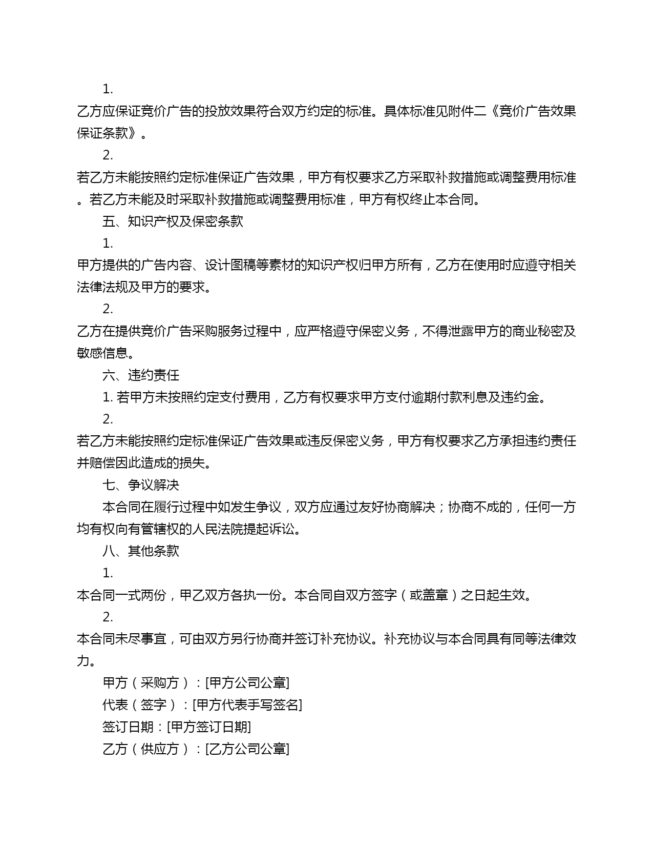 竞价广告采购合同范本合同编号:[合同编号]甲方(采购方):[甲方公司名称]乙方(供应方):[乙方公司名称]根据《中华人民共和国合同法》及相关法律法规的规定,甲乙双方在平等、自愿、公平、诚实信用的基础上,就甲方委托乙方进行竞价广告采购事宜,达成如下协议:一、合作内容1.甲方委托乙方在指定的广告平台上进行竞价广告投放,投放的广告内容、形式、位置、频次等具体事项,由双方另行约定。2.乙方应按照甲方的要求,提供竞价广告采购服务,并确保广告投放的合法性、合规性和有效性。二、合作期限1.本合同自双方签字(或盖章)之日