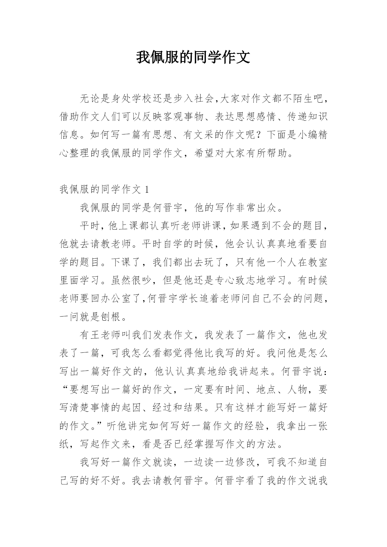 我佩服的同学作文无论是身处学校还是步入社会,大家对作文都不陌生吧,借助作文人们可以反映客观事物、表达思想感情、传递知识信息。如何写一篇有思想、有文采的作文呢?下面是小编精心整理的我佩服的同学作文,希望对大家有所帮助。我佩服的同学作文1我佩服的同学是何晋宇,他的写作非常出众。平时,他上课都认真听老师讲课,如果遇到不会的题目,他就去请教老师。平时自学的时候,他会认认真真地看要自学的题目。下课了,我们都出去玩了,只有他一个人在教室里面学习。虽然很吵,但是他还是专心致志地学习。有时候老师要回办公室了,何晋宇学长追