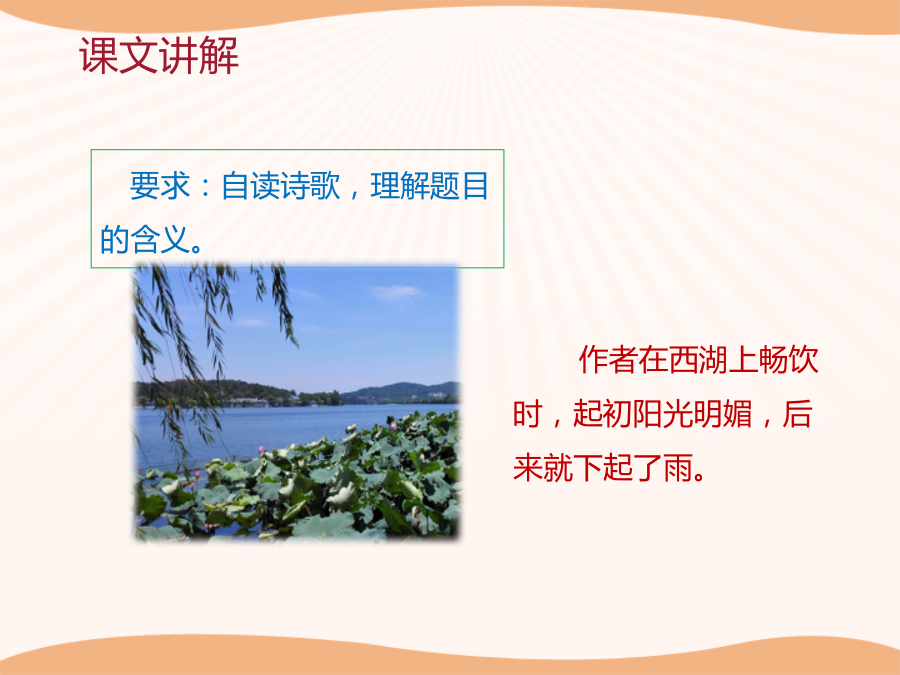 饮湖上初晴后雨古诗-饮湖上初晴后雨的意思饮湖上初晴后雨古诗-饮湖上初晴后雨的意思饮湖上初晴后雨古诗作者是苏轼(1037—1101)字子瞻,号东坡居士,眉州眉山(今四川眉山)人。以下是小编为您收集整理提供到的范文,欢迎阅读参考,希望对你有所帮助!饮湖上初晴后雨古诗_饮湖上初晴后雨的意思饮湖上初晴后雨二首作者:苏轼年代:宋朝曦迎客艳重冈,晚雨留人入醉乡。此意自佳君不会,一杯当属水仙王。(湖上有水仙王庙。)水光潋滟晴方好,山色空濛雨亦奇。欲把西湖比西子,淡妆浓抹总相宜。【作者小传】:苏轼(1037—1101)字