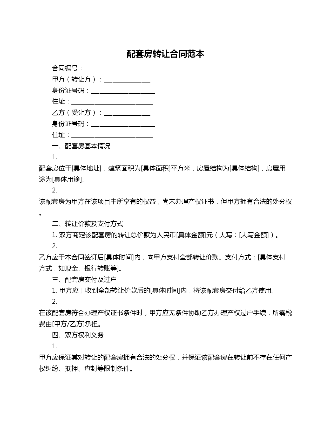 配套房转让合同范本合同编号:______________甲方(转让方):________________身份证号码:______________________住址:____________________________乙方(受让方):________________身份证号码:______________________住址:____________________________一、配套房基本情况1.配套房位于[具体地址],建筑面积为[具体面积]平方米,房屋结构为[具体结构],房屋用途为[具体用途]