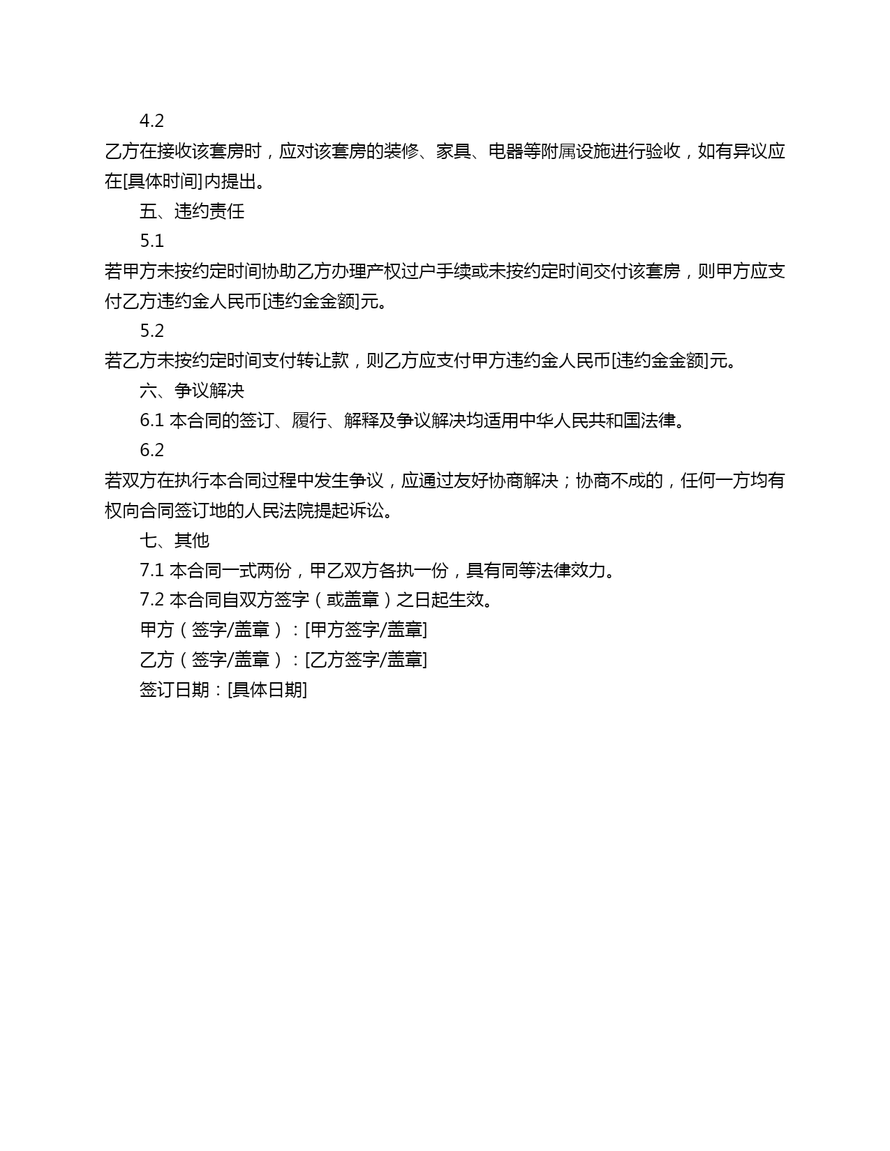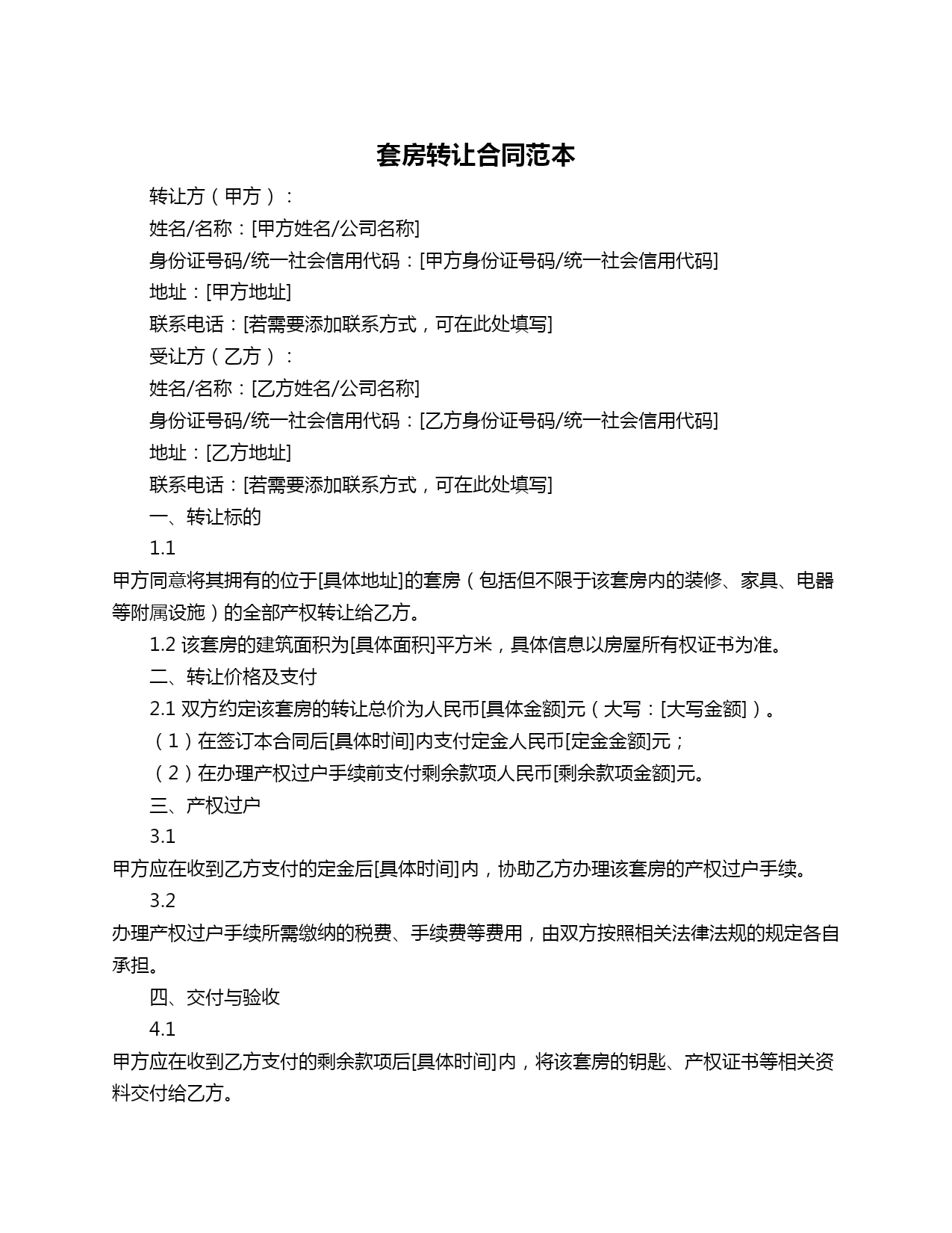 套房转让合同范本转让方(甲方):姓名/名称:[甲方姓名/公司名称]身份证号码/统一社会信用代码:[甲方身份证号码/统一社会信用代码]地址:[甲方地址]联系电话:[若需要添加联系方式,可在此处填写]受让方(乙方):姓名/名称:[乙方姓名/公司名称]身份证号码/统一社会信用代码:[乙方身份证号码/统一社会信用代码]地址:[乙方地址]联系电话:[若需要添加联系方式,可在此处填写]一、转让标的1.1甲方同意将其拥有的位于[具体地址]的套房(包括但不限于该套房内的装修、家具、电器等附属设施)的全部产权转让给乙方。1