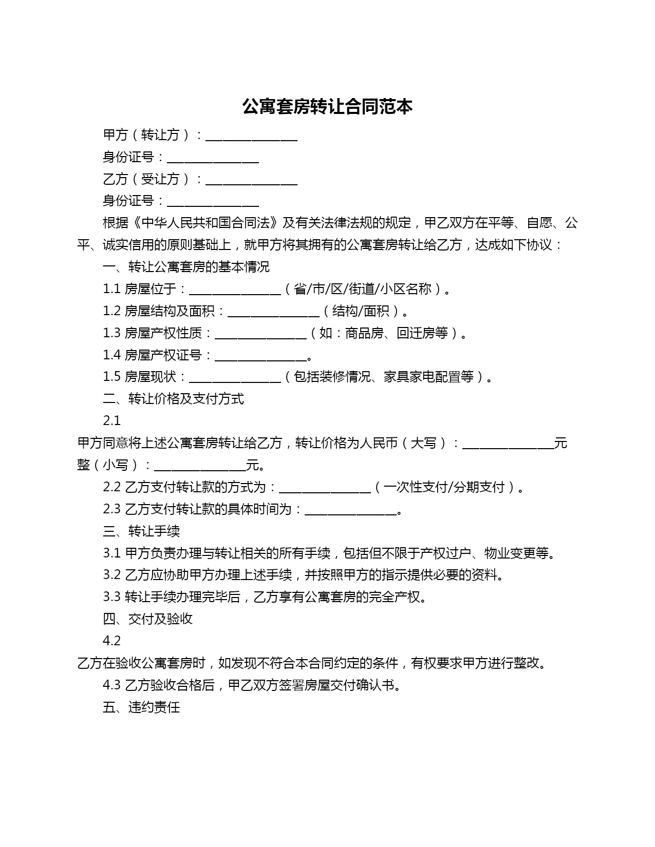公寓套房转让合同范本甲方(转让方):________________身份证号:________________乙方(受让方):________________身份证号:________________根据《中华人民共和国合同法》及有关法律法规的规定,甲乙双方在平等、自愿、公平、诚实信用的原则基础上,就甲方将其拥有的公寓套房转让给乙方,达成如下协议:一、转让公寓套房的基本情况1.1房屋位于:________________(省/市/区/街道/小区名称)。1.2房屋结构及面积:________________