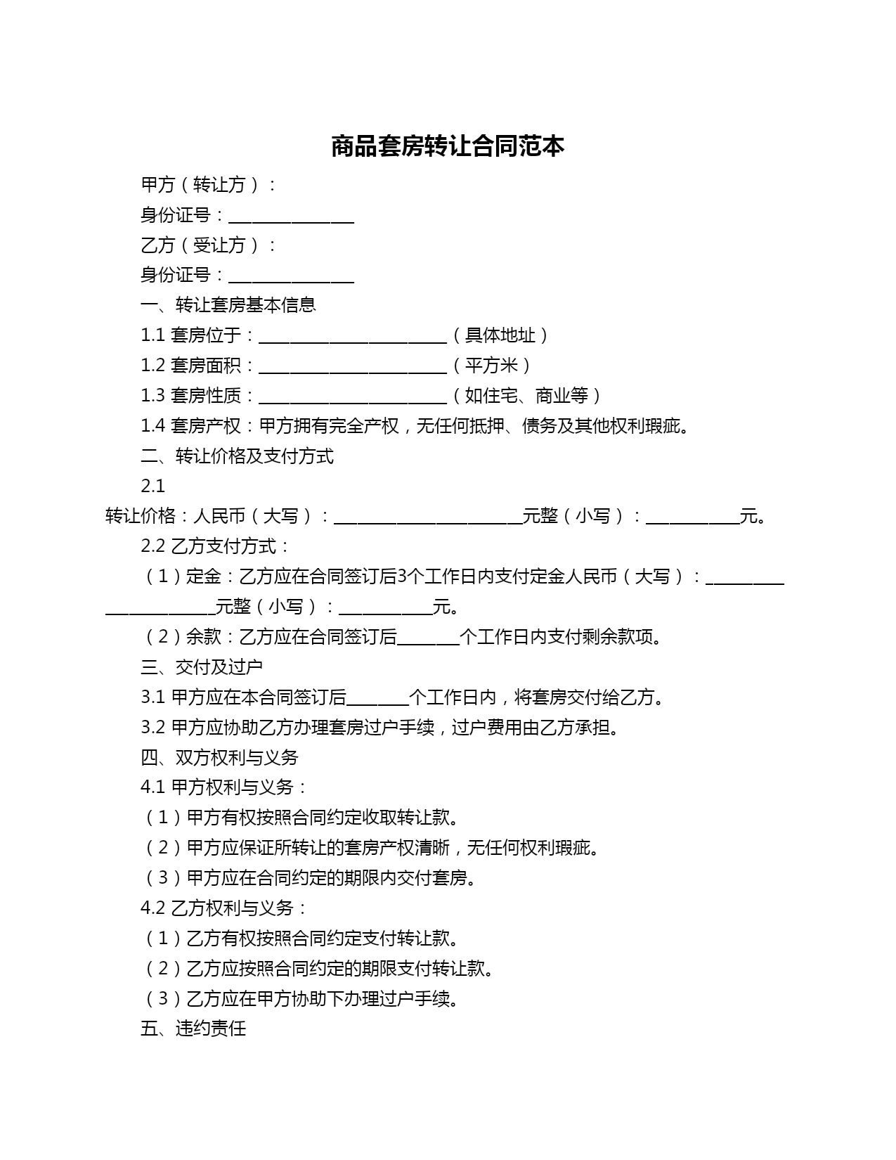商品套房转让合同范本甲方(转让方):身份证号:________________乙方(受让方):身份证号:________________一、转让套房基本信息1.1套房位于:________________________(具体地址)1.2套房面积:________________________(平方米)1.3套房性质:________________________(如住宅、商业等)1.4套房产权:甲方拥有完全产权,无任何抵押、债务及其他权利瑕疵。二、转让价格及支付方式2.1转让价格:人民币(大写):_