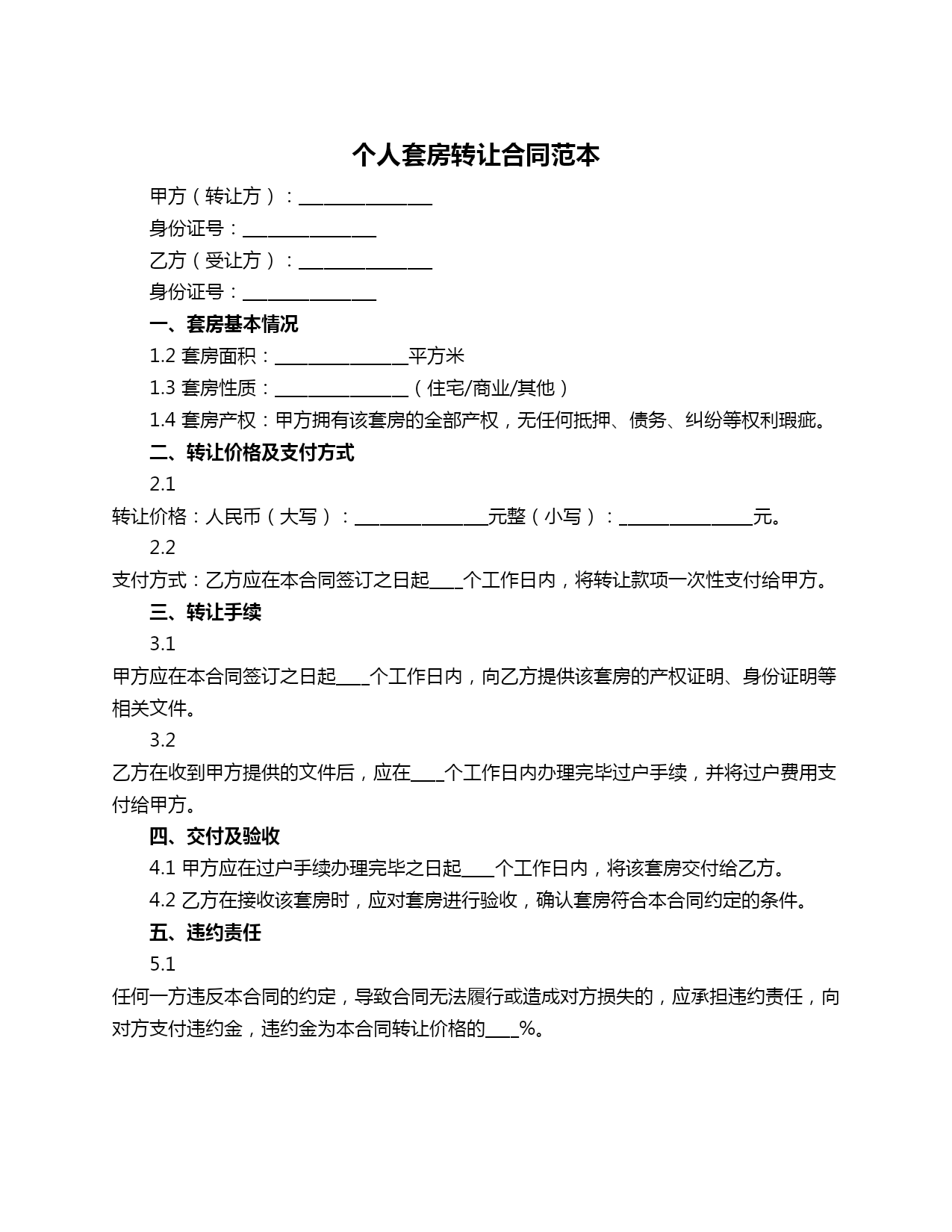 个人套房转让合同范本甲方(转让方):________________身份证号:________________乙方(受让方):________________身份证号:________________一、套房基本情况1.2套房面积:________________平方米1.3套房性质:________________(住宅/商业/其他)1.4套房产权:甲方拥有该套房的全部产权,无任何抵押、债务、纠纷等权利瑕疵。二、转让价格及支付方式2.1转让价格:人民币(大写):________________元整(小写