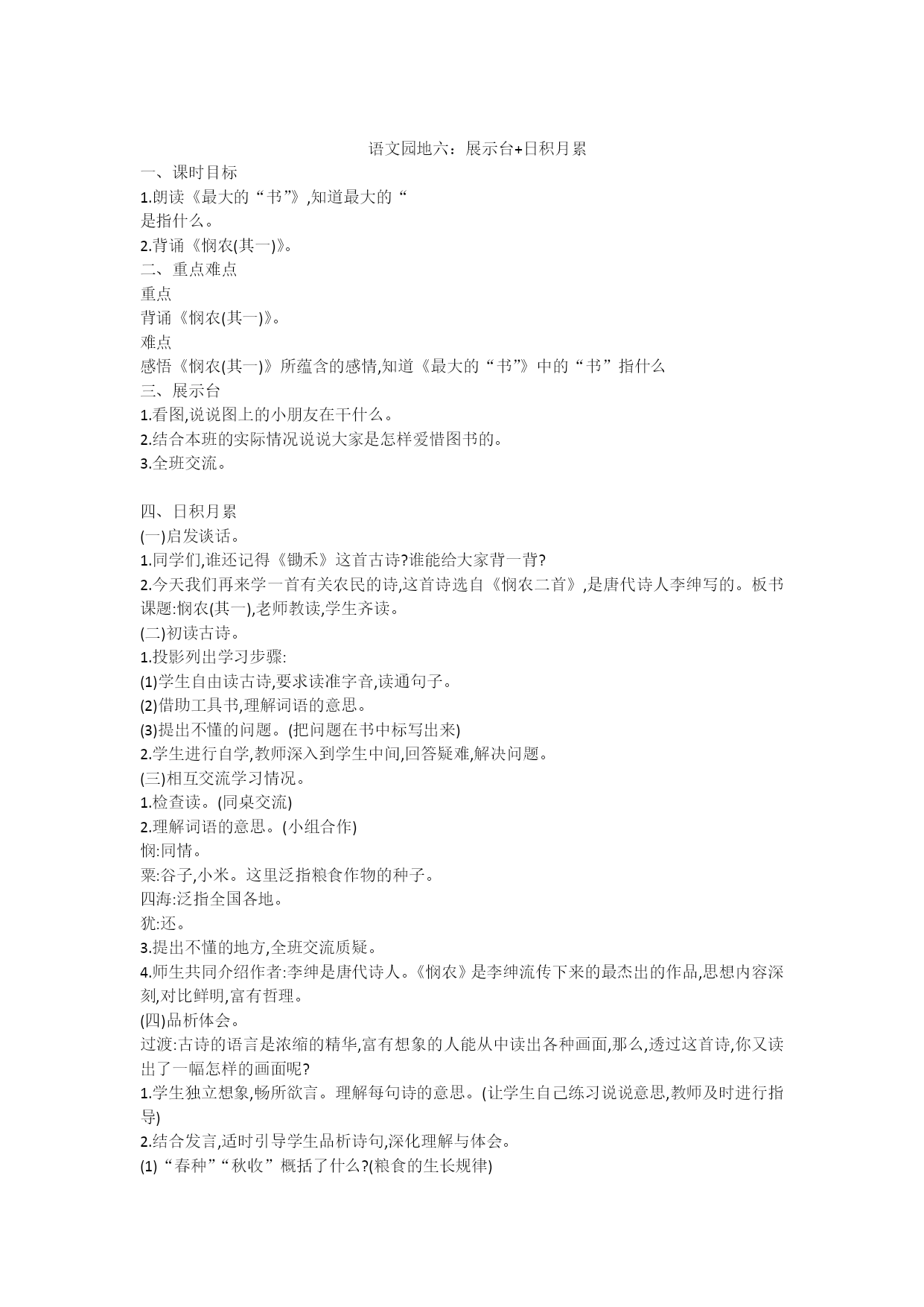 语文园地六:展示台+日积月累一、课时目标1.朗读《最大的“书”》,知道最大的“是指什么。2.背诵《悯农(其一)》。二、重点难点重点背诵《悯农(其一)》。难点感悟《悯农(其一)》所蕴含的感情,知道《最大的“书”》中的“书”指什么三、展示台1.看图,说说图上的小朋友在干什么。2.结合本班的实际情况说说大家是怎样爱惜图书的。3.全班交流。四、日积月累(一)启发谈话。1.同学们,谁还记得《锄禾》这首古诗?谁能给大家背一背?2.今天我们再来学一首有关农民的诗,这首诗选自《悯农二首》,是唐代诗人李绅写的。板书课题:悯