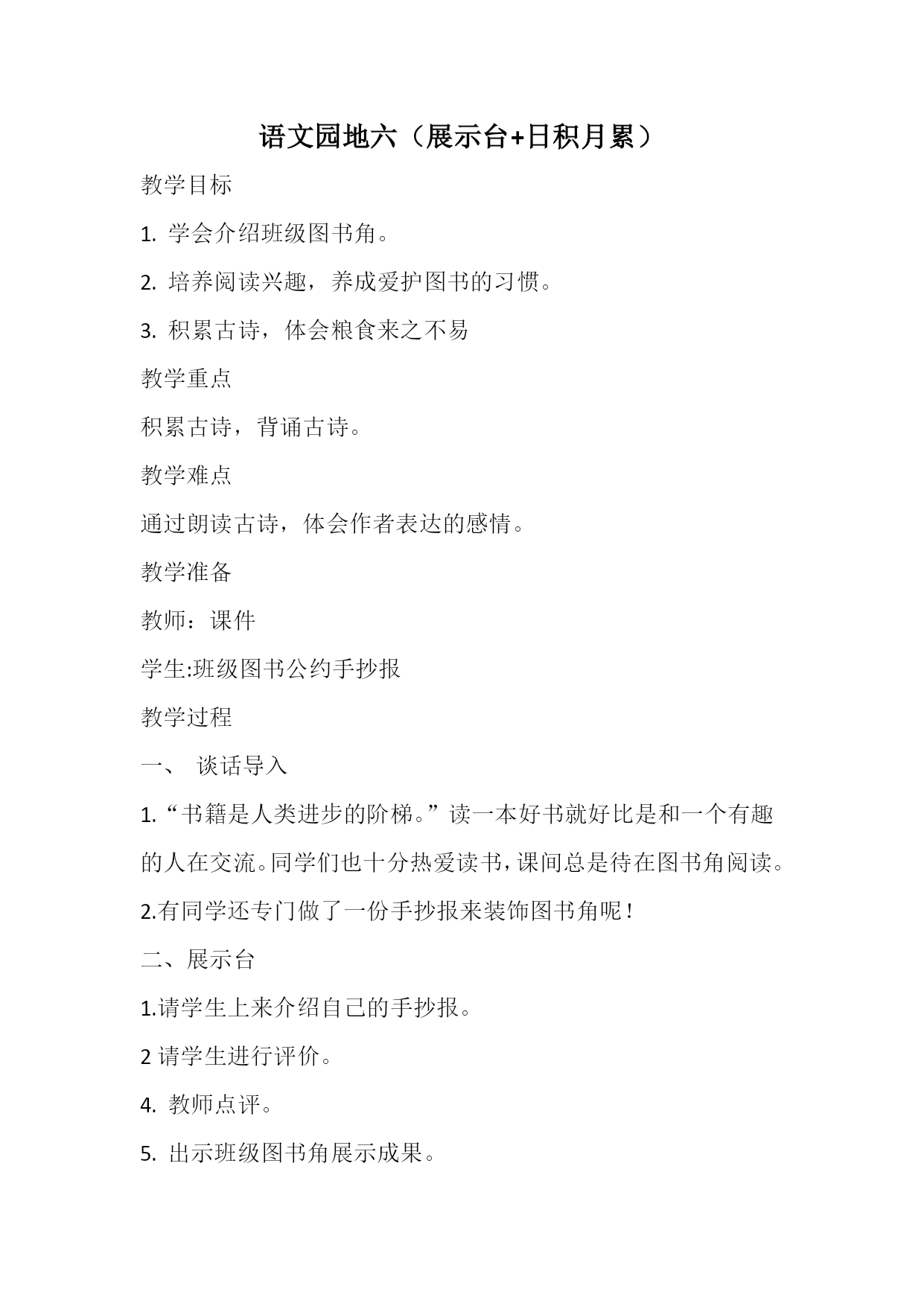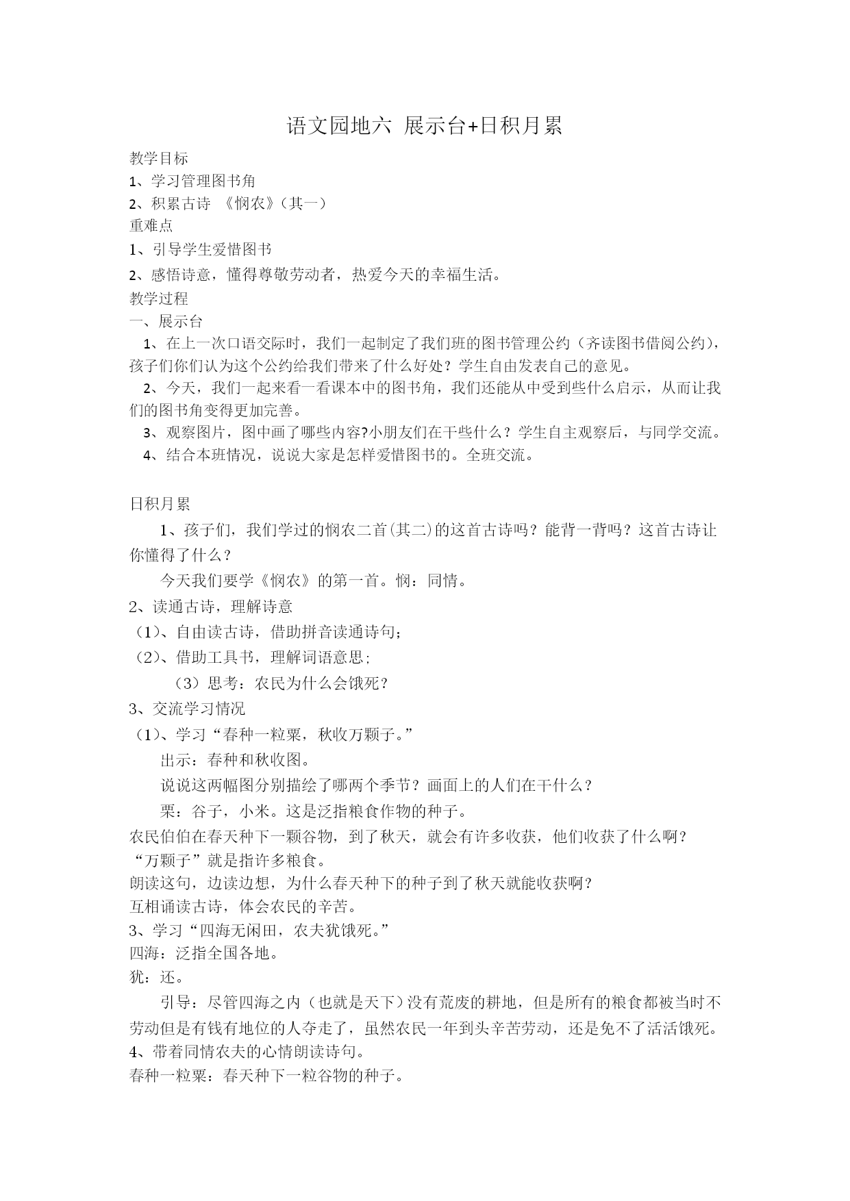 语文园地六展示台+日积月累教学目标学习管理图书角积累古诗《悯农》(其一)重难点引导学生爱惜图书2、感悟诗意,懂得尊敬劳动者,热爱今天的幸福生活。教学过程展示台1、在上一次口语交际时,我们一起制定了我们班的图书管理公约(齐读图书借阅公约),孩子们你们认为这个公约给我们带来了什么好处?学生自由发表自己的意见。2、今天,我们一起来看一看课本中的图书角,我们还能从中受到些什么启示,从而让我们的图书角变得更加完善。3、观察图片,图中画了哪些内容?小朋友们在干些什么?学生自主观察后,与同学交流。4、结合本班情况,说说