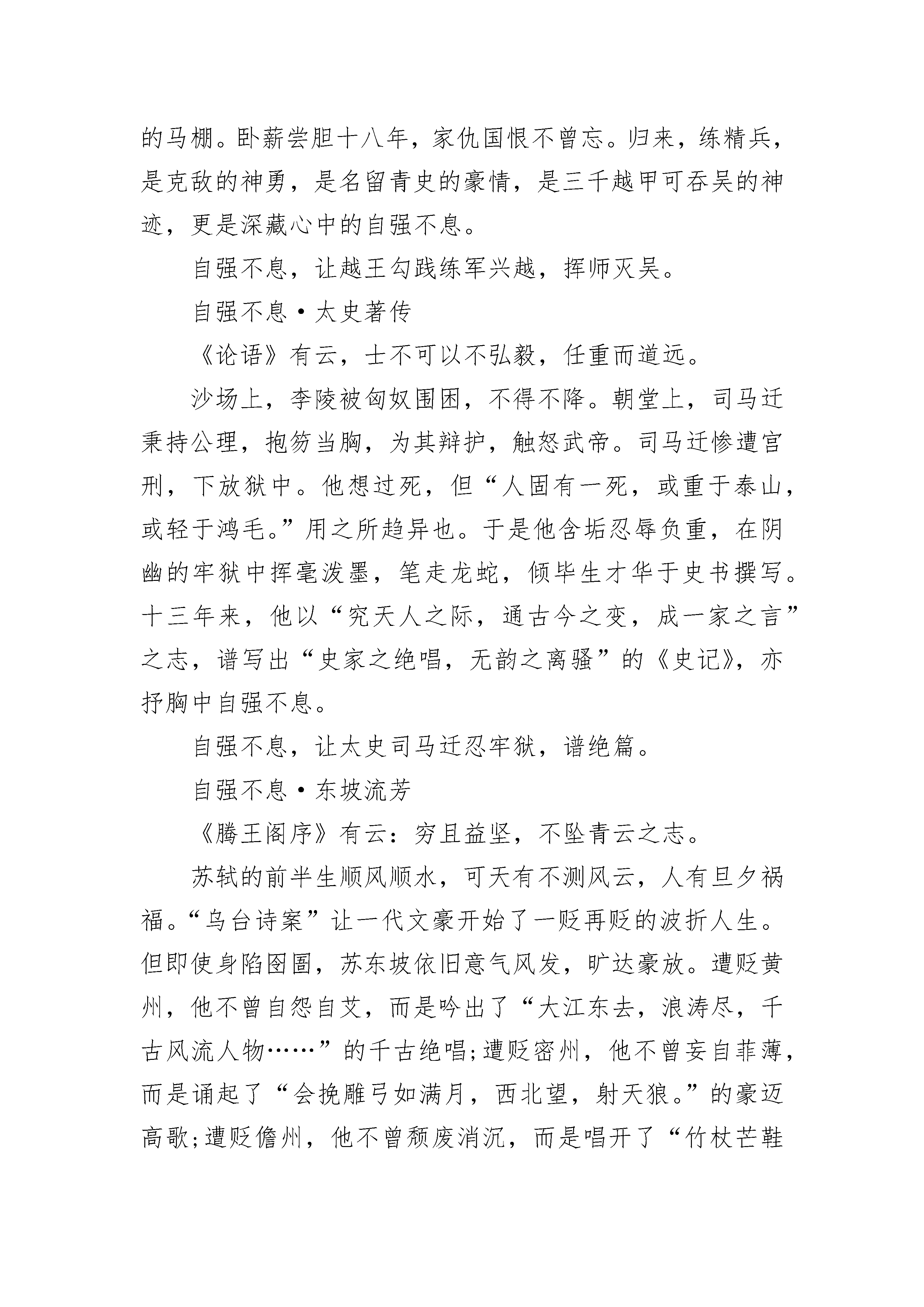 自强不息的高一语文作文自强不息的高一语文作文在学习、工作或生活中,大家都尝试过写作文吧,作文根据体裁的不同可以分为记叙文、说明文、应用文、议论文。怎么写作文才能避免踩雷呢?以下是小编为大家收集的自强不息的高一语文作文,欢迎大家借鉴与参考,希望对大家有所帮助。自强不息的高一语文作文1雄鹰搏击长空,翱翔千里,须经历折翼之痛,断喙之苦;腊梅风雅出尘,玉骨凉肌,须承受凝霜之寒,风雪之摧。人生坎坷,唯有直面逆境,自强不息,方能成就自我,实现人生价值。踏入历史,进入先贤的人生。我遇见了你,你是王安石。你独自来到塔顶,