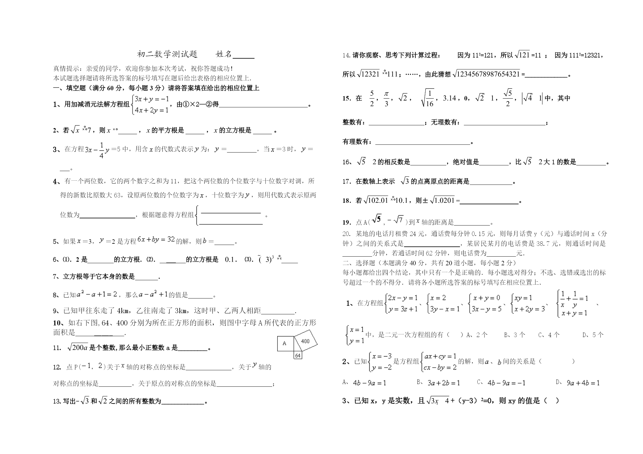 初二数学测试题姓名真情提示:亲爱的同学,欢迎你参加本次考试,祝你答题成功!本试题选择题请将所选答案的标号填写在题后给出表格的相应位置上.一、填空题(满分60分,每小题3分)请将答案填在给出的相应位置上1、用加减消元法解方程组,由①×2—②得。2、若,则,的平方根是,的立方根是。3、在方程=5中,用含的代数式表示为:=,当=3时,=。4、有一个两位数,它的两个数字之和为11,把这个两位数的个位数字与十位数字对调,所得的新数比原数大63,设原两位数的个位数字为,十位数字为,则用代数式表示原两位数为,根据题意得