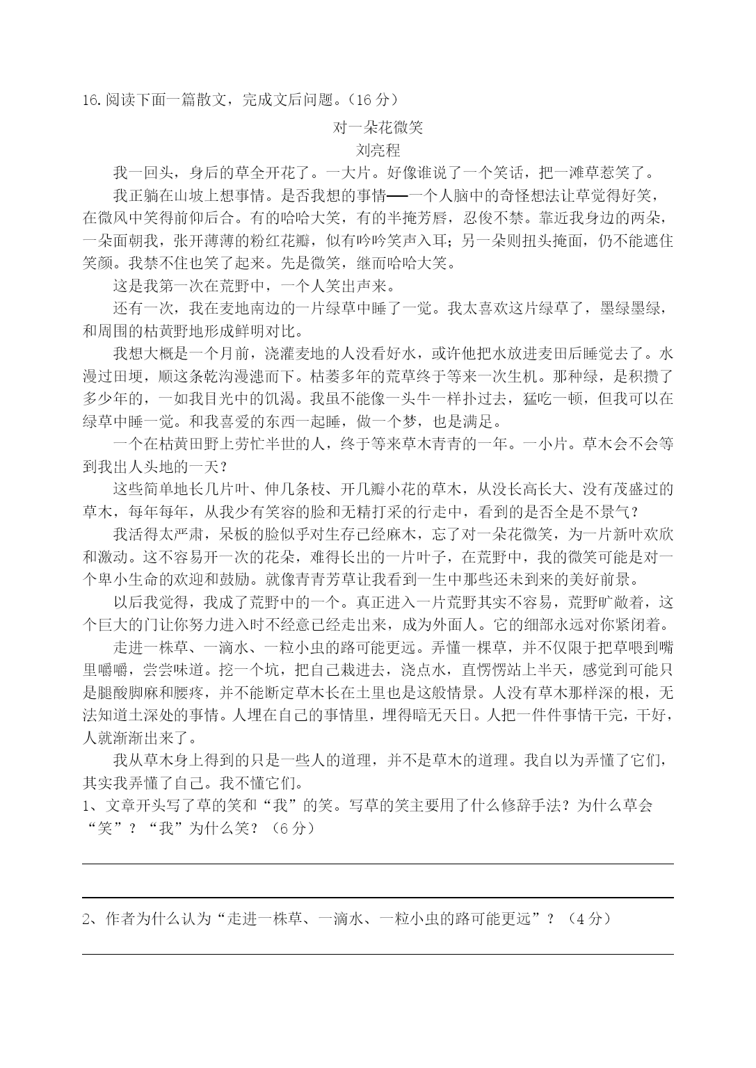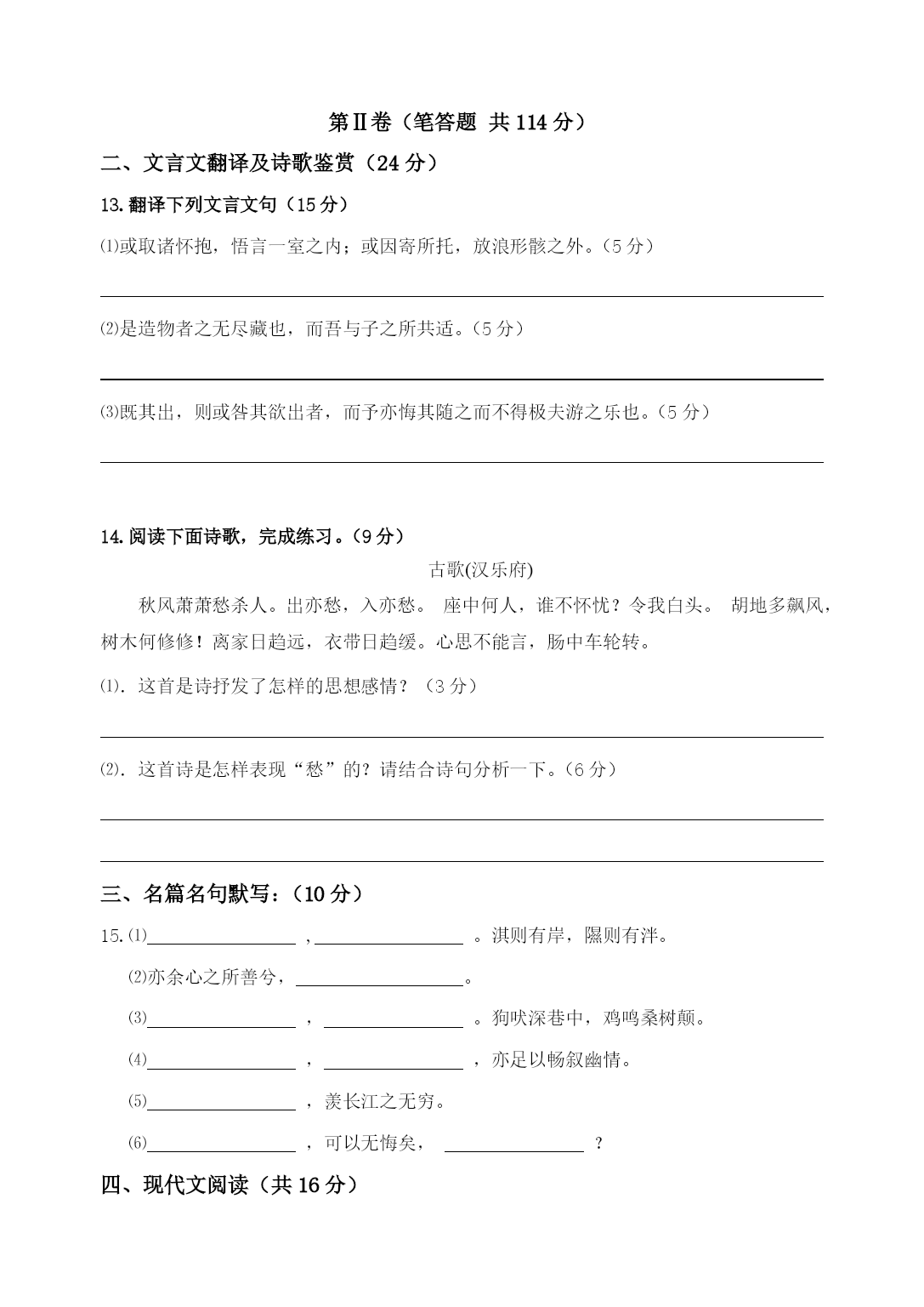 高一语文(必修二)期末质量检测试题(卷)命题人:马莉宁(教研室)检测人:毛国兴(东风路高中)注意:本套试卷共六大题,请将客观选择题的答案用2B铅笔涂于答题卡上,将主观笔答题答案认真书写在答题卷上。分值为150分。第Ⅰ卷(选择题共36分)一、基础知识(12×3=36分)1.下列加点字的注音,全都正确的一项是()A.瞥(piē)见提(dī)防形骸(hái)渐(jiān)车帷裳B.吐哺(bǔ)颤(chàn)动肖(xiào)像望风披靡(mí)C.迤(yǐ)逦纤(xiān)细管弦(xuán)载(zài)笑载言D.低