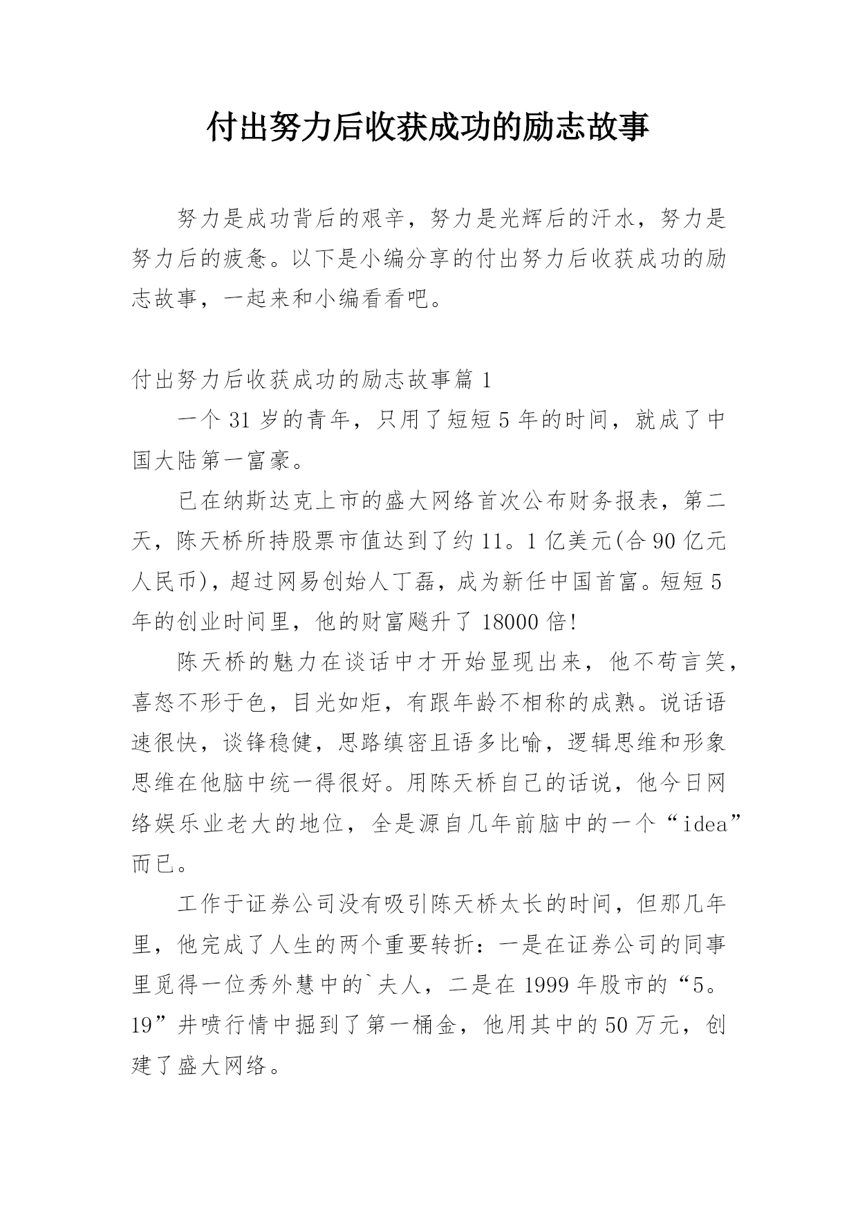 付出努力后收获成功的励志故事付出努力后收获成功的励志故事努力是成功背后的艰辛,努力是光辉后的汗水,努力是努力后的疲惫。以下是小编分享的付出努力后收获成功的励志故事,一起来和小编看看吧。付出努力后收获成功的励志故事篇1一个31岁的青年,只用了短短5年的时间,就成了中国大陆第一富豪。已在纳斯达克上市的盛大网络首次公布财务报表,第二天,陈天桥所持股票市值达到了约11。1亿美元(合90亿元人民币),超过网易创始人丁磊,成为新任中国首富。短短5年的创业时间里,他的财富飚升了18000倍!陈天桥的魅力在谈话中才开始显