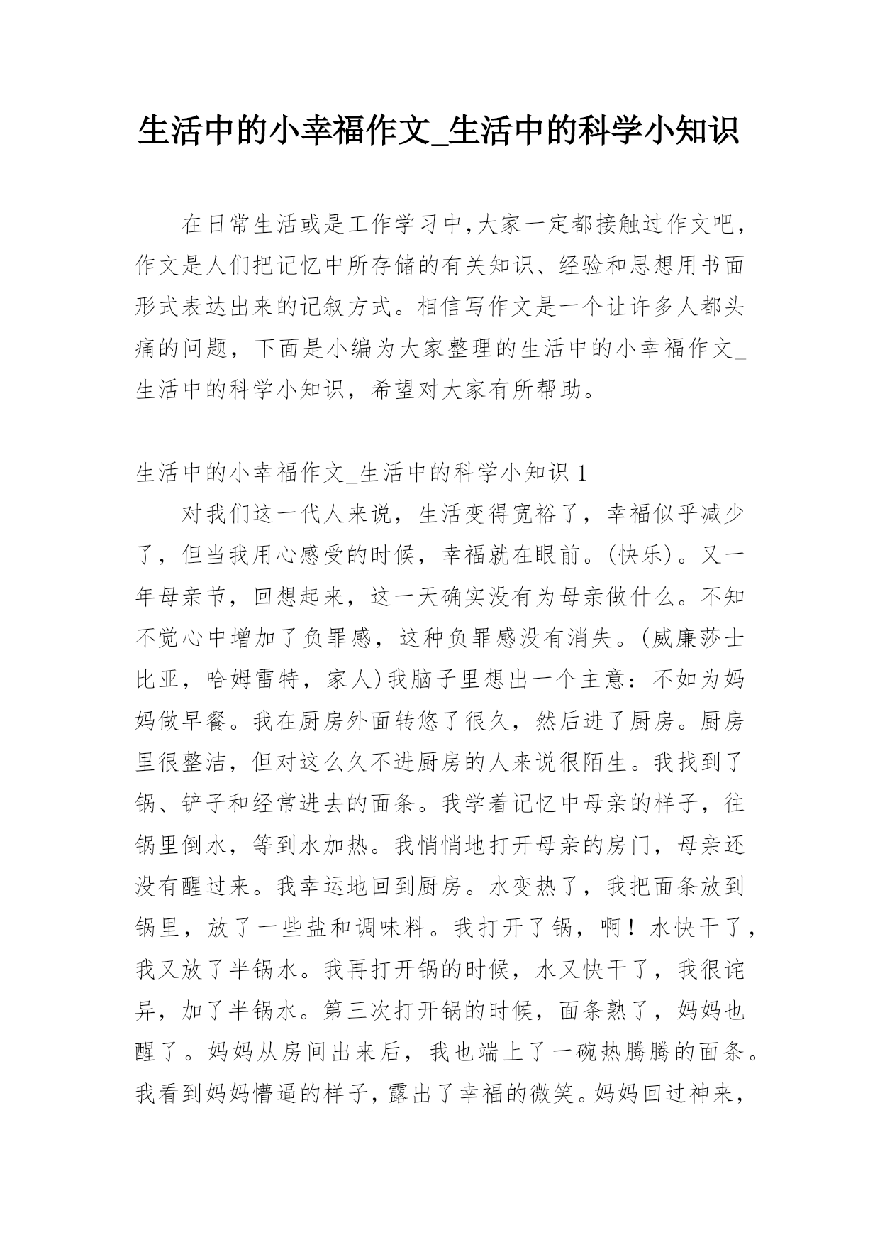 生活中的小幸福作文_生活中的科学小知识生活中的小幸福作文_生活中的科学小知识在日常生活或是工作学习中,大家一定都接触过作文吧,作文是人们把记忆中所存储的有关知识、经验和思想用书面形式表达出来的记叙方式。相信写作文是一个让许多人都头痛的问题,下面是小编为大家整理的生活中的小幸福作文_生活中的科学小知识,希望对大家有所帮助。生活中的小幸福作文_生活中的科学小知识1对我们这一代人来说,生活变得宽裕了,幸福似乎减少了,但当我用心感受的时候,幸福就在眼前。(快乐)。又一年母亲节,回想起来,这一天确实没有为母亲做什么