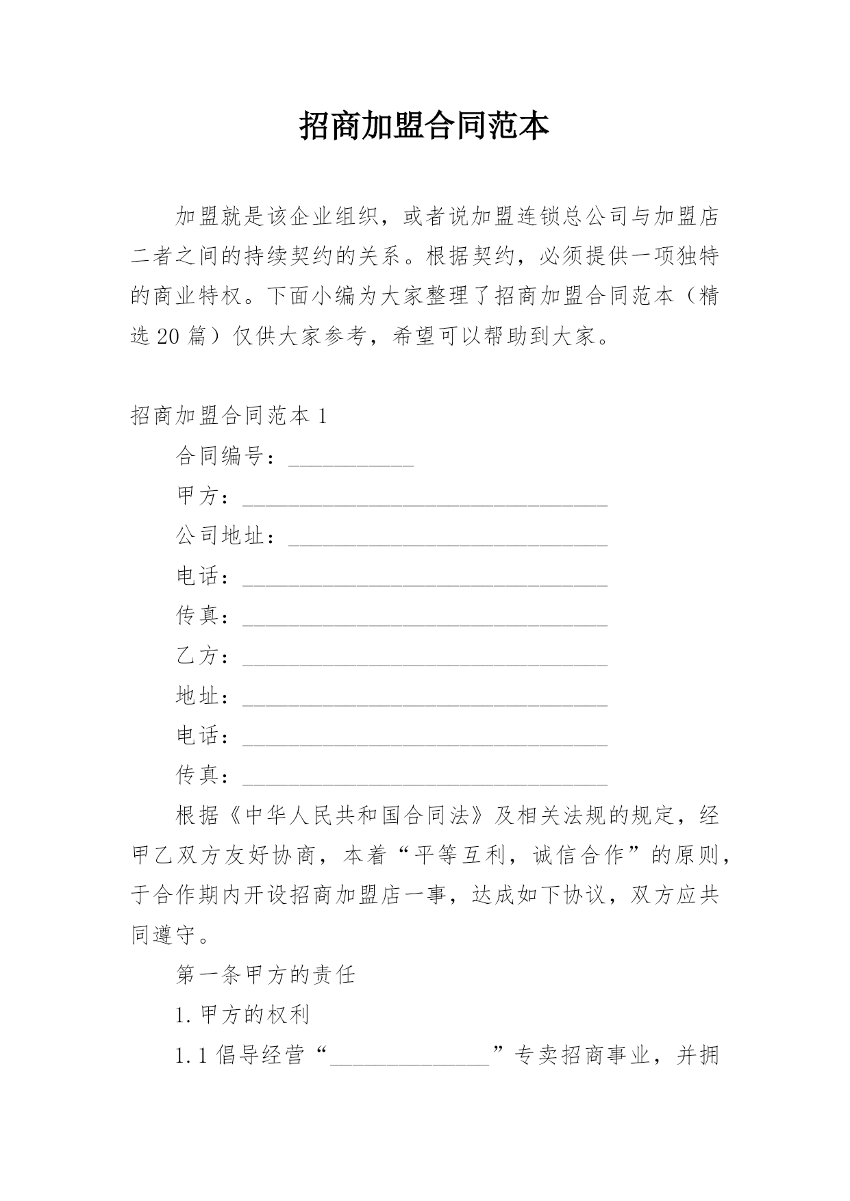 招商加盟合同范本加盟就是该企业组织,或者说加盟连锁总公司与加盟店二者之间的持续契约的关系。根据契约,必须提供一项独特的商业特权。下面小编为大家整理了招商加盟合同范本(精选20篇)仅供大家参考,希望可以帮助到大家。招商加盟合同范本1合同编号:___________甲方:________________________________公司地址:____________________________电话:________________________________传真:__________________