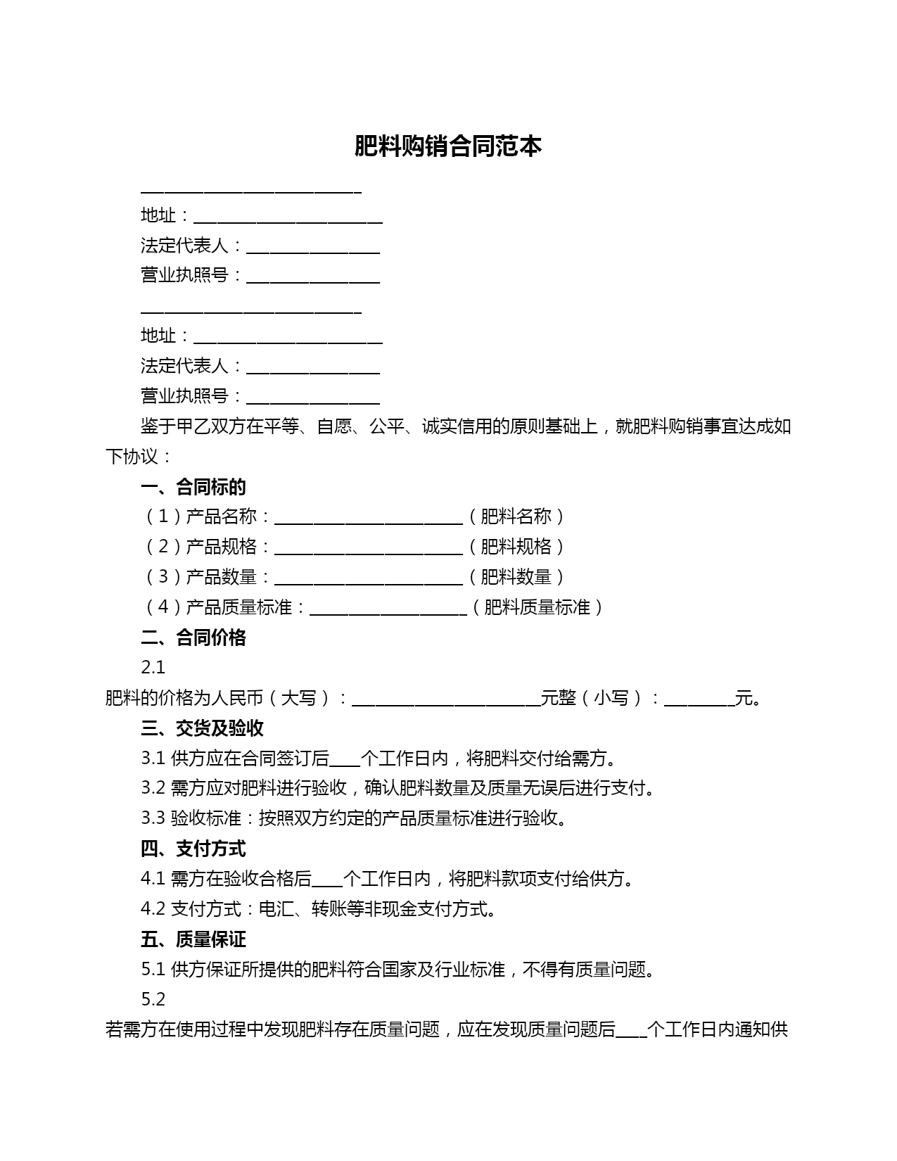 肥料购销合同范本____________________________地址:________________________法定代表人:_________________营业执照号:_____________________________________________地址:________________________法定代表人:_________________营业执照号:_________________鉴于甲乙双方在平等、自愿、公平、诚实信用的原则基础上,就肥料购销事宜达成如下协议:一、合同