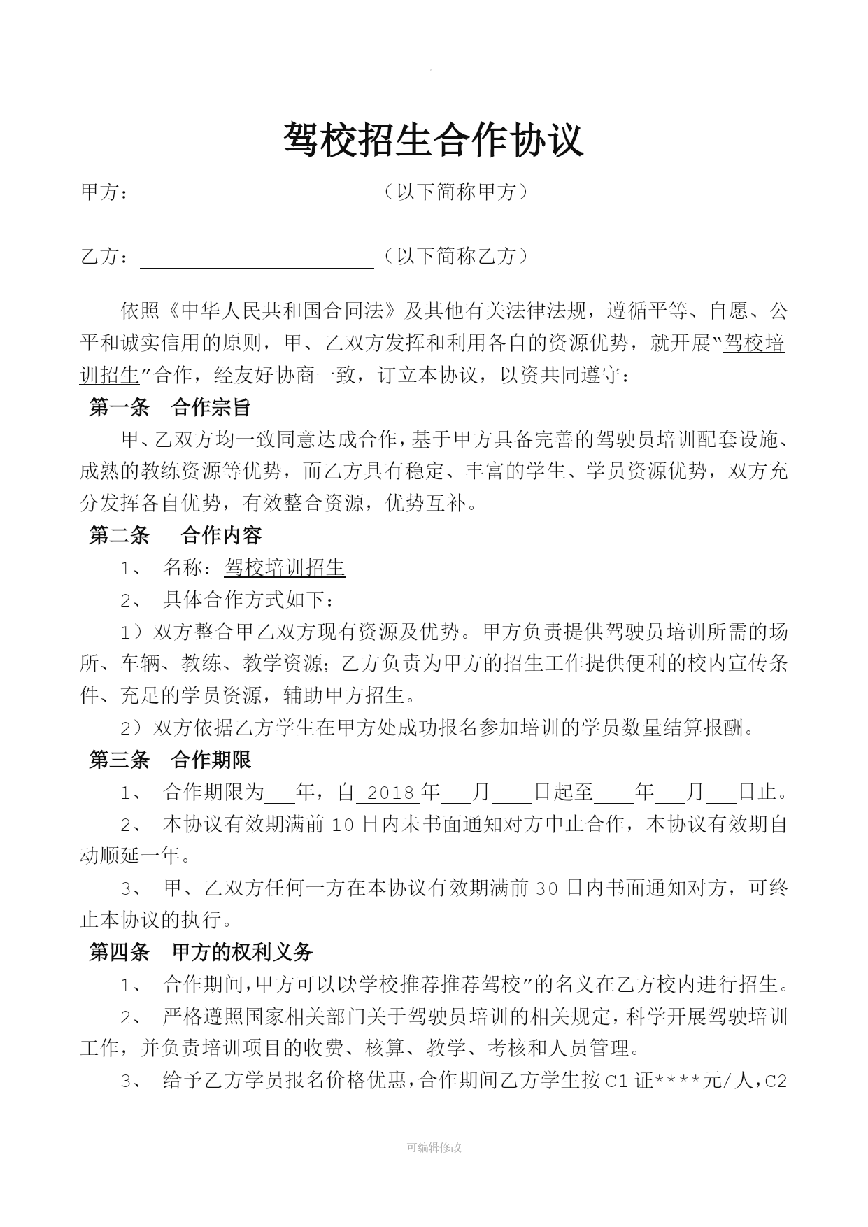。-可编辑修改-驾校招生合作协议甲方:(以下简称甲方)乙方:(以下简称乙方)依照《中华人民共和国合同法》及其他有关法律法规,遵循平等、自愿、公平和诚实信用的原则,甲、乙双方发挥和利用各自的资源优势,就开展“驾校培训招生”合作,经友好协商一致,订立本协议,以资共同遵守:合作宗旨甲、乙双方均一致同意达成合作,基于甲方具备完善的驾驶员培训配套设施、成熟的教练资源等优势,而乙方具有稳定、丰富的学生、学员资源优势,双方充分发挥各自优势,有效整合资源,优势互补。合作内容名称:驾校培训招生具体合作方式如下:1)双方整合