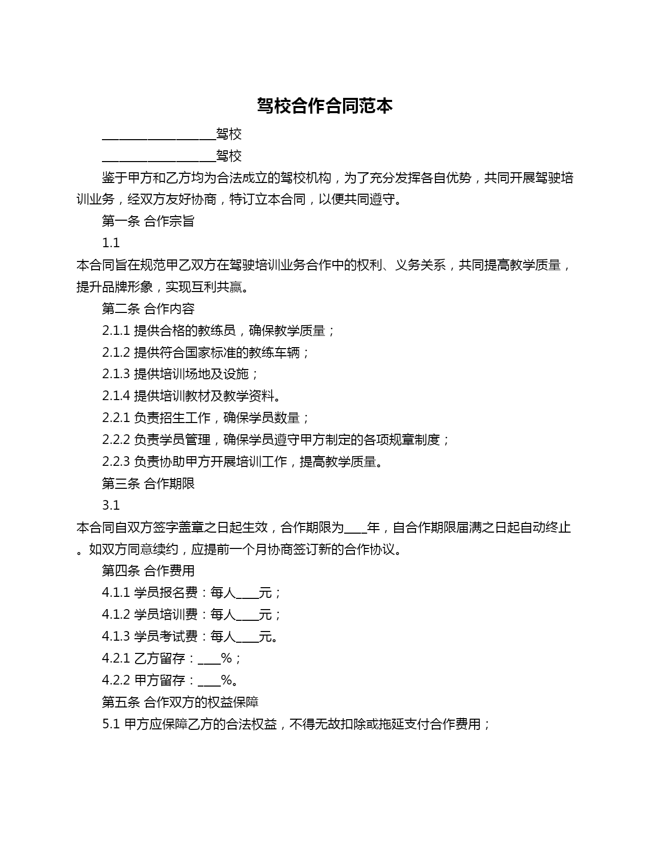驾校合作合同范本____________________驾校____________________驾校鉴于甲方和乙方均为合法成立的驾校机构,为了充分发挥各自优势,共同开展驾驶培训业务,经双方友好协商,特订立本合同,以便共同遵守。第一条合作宗旨1.1本合同旨在规范甲乙双方在驾驶培训业务合作中的权利、义务关系,共同提高教学质量,提升品牌形象,实现互利共赢。第二条合作内容2.1.1提供合格的教练员,确保教学质量;2.1.2提供符合国家标准的教练车辆;2.1.3提供培训场地及设施;2.1.4提供培训教材及教学资