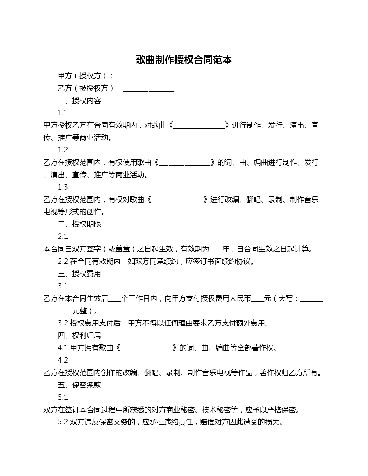 歌曲制作授权合同范本甲方(授权方):________________乙方(被授权方):________________一、授权内容1.1甲方授权乙方在合同有效期内,对歌曲《________________》进行制作、发行、演出、宣传、推广等商业活动。1.2乙方在授权范围内,有权使用歌曲《________________》的词、曲、编曲进行制作、发行、演出、宣传、推广等商业活动。1.3乙方在授权范围内,有权对歌曲《________________》进行改编、翻唱、录制、制作音乐电视等形式的创作。二、授权期限