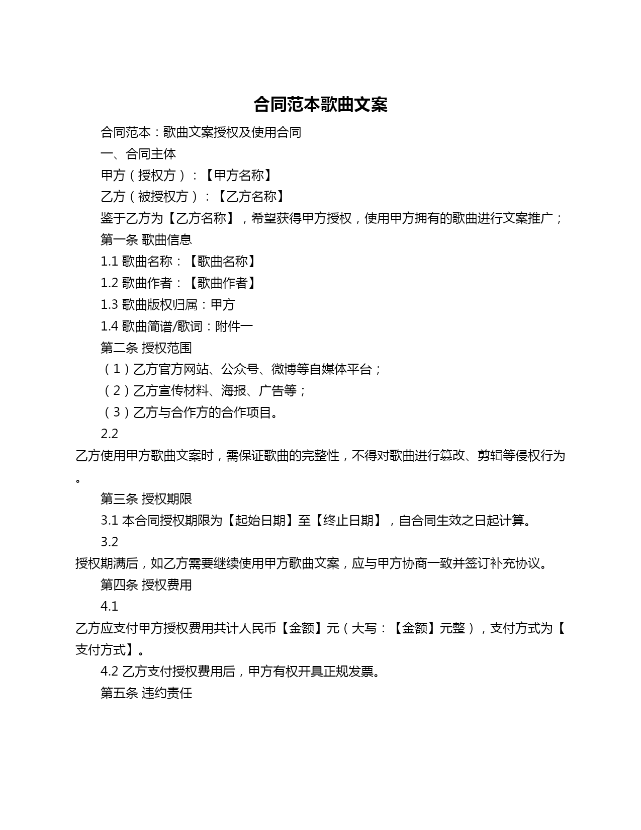 合同范本歌曲文案合同范本:歌曲文案授权及使用合同一、合同主体甲方(授权方):【甲方名称】乙方(被授权方):【乙方名称】鉴于乙方为【乙方名称】,希望获得甲方授权,使用甲方拥有的歌曲进行文案推广;第一条歌曲信息1.1歌曲名称:【歌曲名称】1.2歌曲作者:【歌曲作者】1.3歌曲版权归属:甲方1.4歌曲简谱/歌词:附件一第二条授权范围(1)乙方官方网站、公众号、微博等自媒体平台;(2)乙方宣传材料、海报、广告等;(3)乙方与合作方的合作项目。2.2乙方使用甲方歌曲文案时,需保证歌曲的完整性,不得对歌曲进行篡改、剪