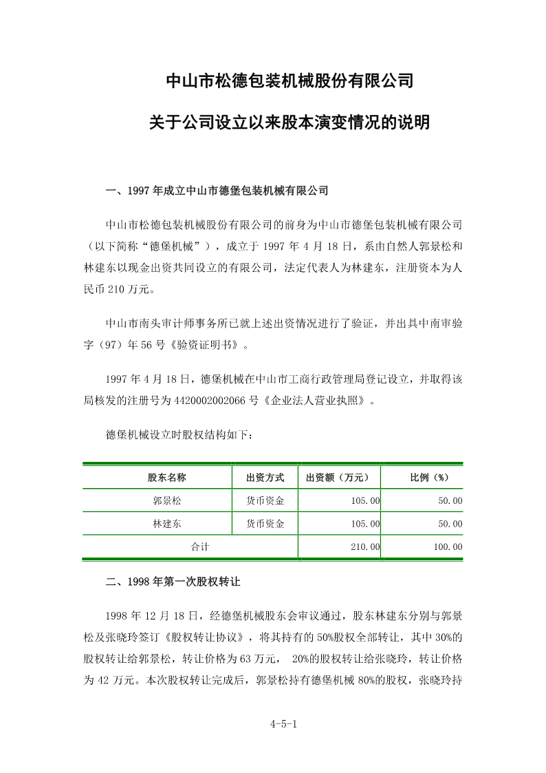 中山市松德包装机械股份有限公司关于公司设立以来股本演变情况的说明一、1997年成立中山市德堡包装机械有限公司中山市松德包装机械股份有限公司的前身为中山市德堡包装机械有限公司(以下简称“德堡机械”),成立于1997年4月18日,系由自然人郭景松和林建东以现金出资共同设立的有限公司,法定代表人为林建东,注册资本为人民币210万元。中山市南头审计师事务所已就上述出资情况进行了验证,并出具中南审验字(97)年56号《验资证明书》。1997年4月18日,德堡机械在中山市工商行政管理局登记设立,并取得该局核发的注册号