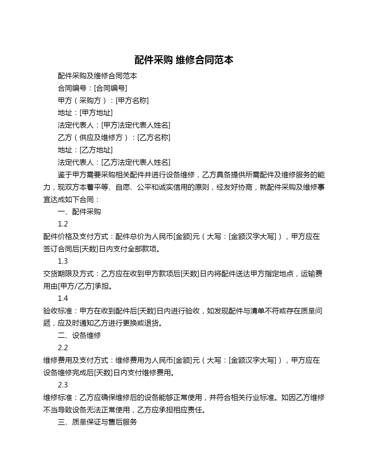 配件采购维修合同范本配件采购及维修合同范本合同编号:[合同编号]甲方(采购方):[甲方名称]地址:[甲方地址]法定代表人:[甲方法定代表人姓名]乙方(供应及维修方):[乙方名称]地址:[乙方地址]法定代表人:[乙方法定代表人姓名]鉴于甲方需要采购相关配件并进行设备维修,乙方具备提供所需配件及维修服务的能力,现双方本着平等、自愿、公平和诚实信用的原则,经友好协商,就配件采购及维修事宜达成如下合同:一、配件采购1.2配件价格及支付方式:配件总价为人民币[金额]元(大写:[金额汉字大写]),甲方应在签订合同后[
