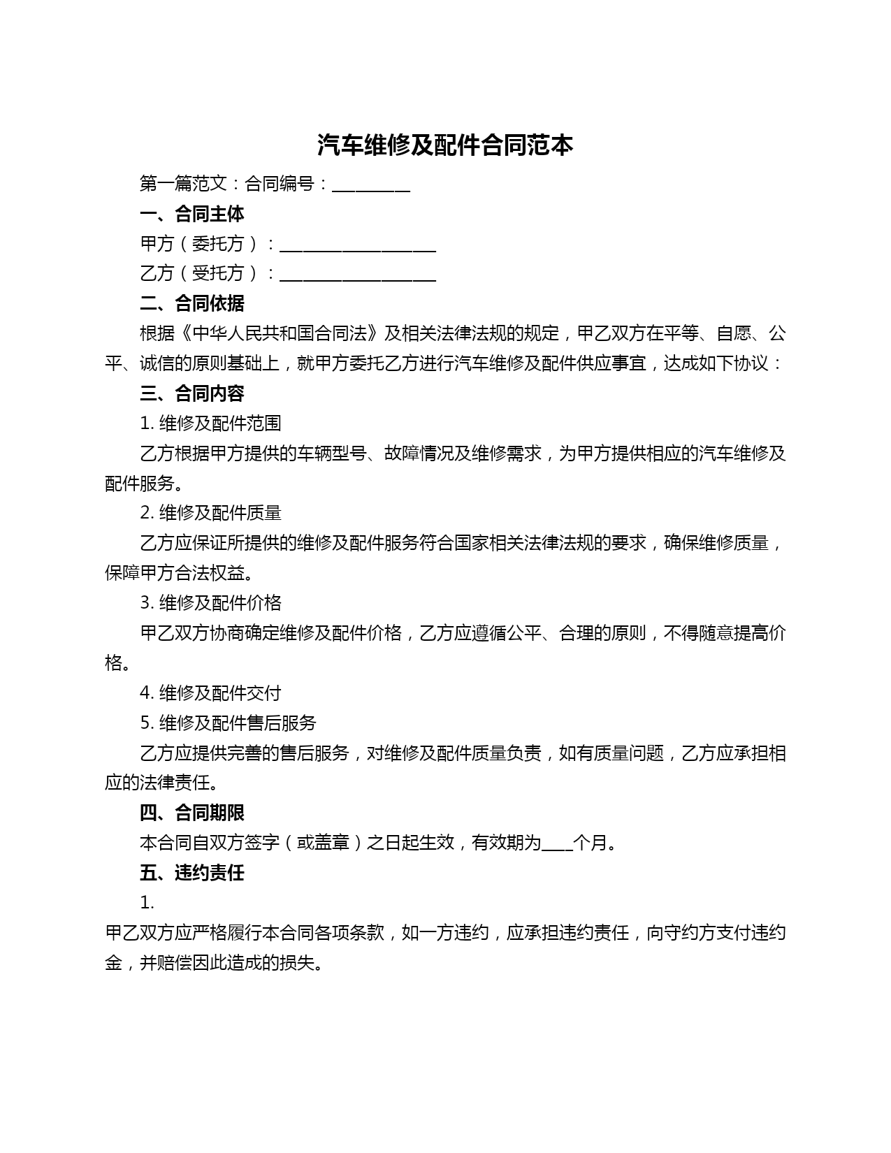 汽车维修及配件合同范本第一篇范文:合同编号:__________一、合同主体甲方(委托方):____________________乙方(受托方):____________________二、合同依据根据《中华人民共和国合同法》及相关法律法规的规定,甲乙双方在平等、自愿、公平、诚信的原则基础上,就甲方委托乙方进行汽车维修及配件供应事宜,达成如下协议:三、合同内容1.维修及配件范围乙方根据甲方提供的车辆型号、故障情况及维修需求,为甲方提供相应的汽车维修及配件服务。2.维修及配件质量乙方应保证所提供的维修及配