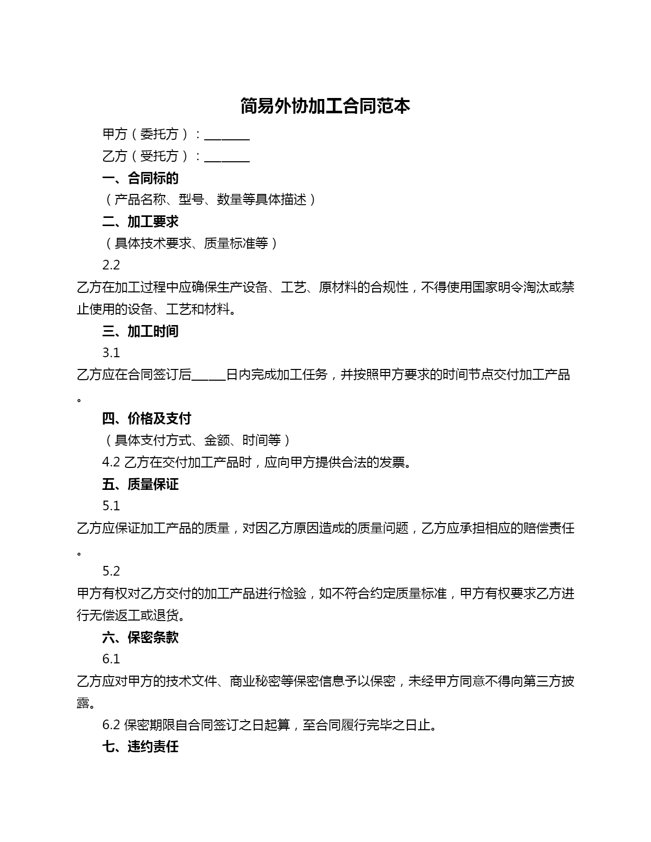简易外协加工合同范本甲方(委托方):________乙方(受托方):________一、合同标的(产品名称、型号、数量等具体描述)二、加工要求(具体技术要求、质量标准等)2.2乙方在加工过程中应确保生产设备、工艺、原材料的合规性,不得使用国家明令淘汰或禁止使用的设备、工艺和材料。三、加工时间3.1乙方应在合同签订后______日内完成加工任务,并按照甲方要求的时间节点交付加工产品。四、价格及支付(具体支付方式、金额、时间等)4.2乙方在交付加工产品时,应向甲方提供合法的发票。五、质量保证5.1乙方应保证加