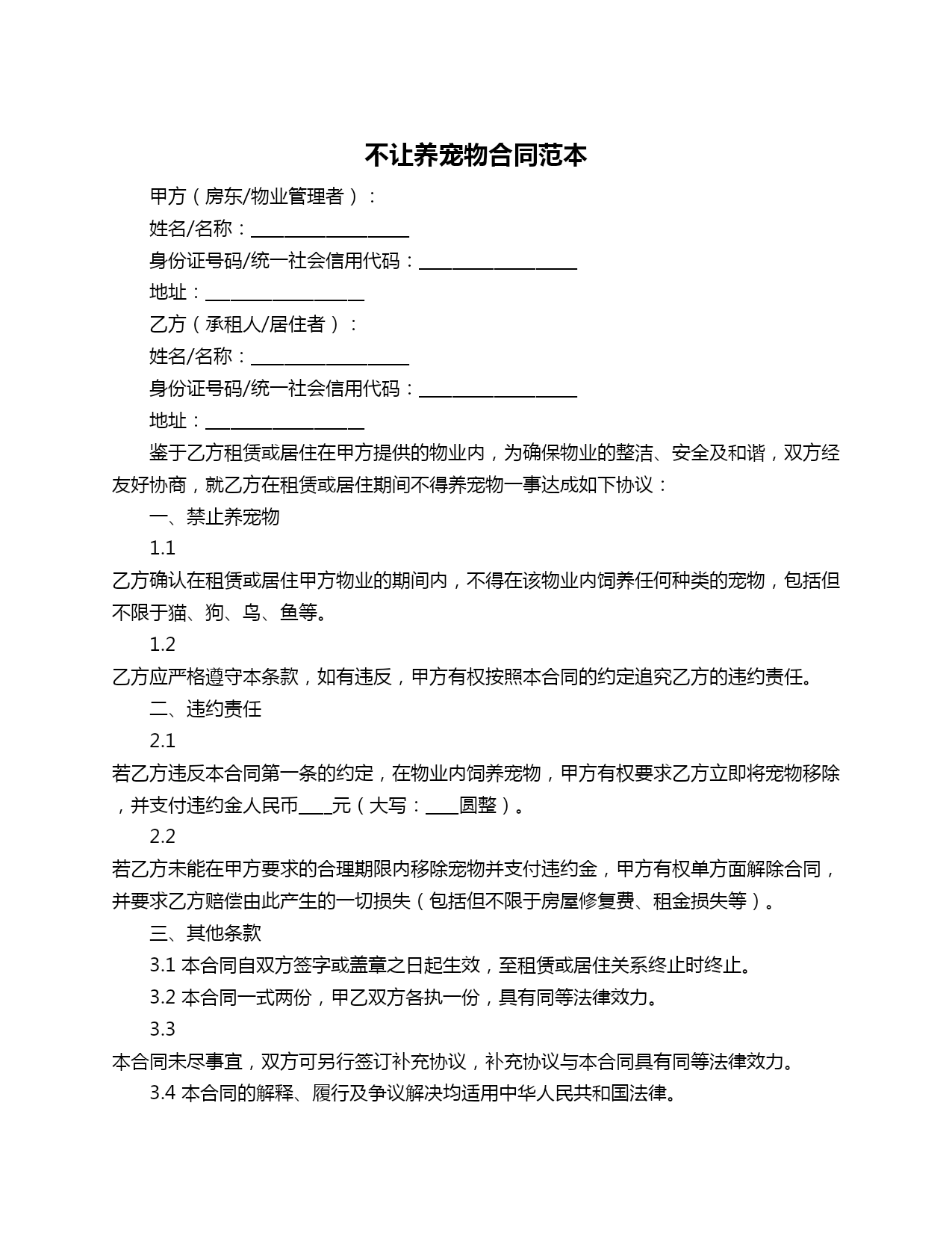 不让养宠物合同范本甲方(房东/物业管理者):姓名/名称:___________________身份证号码/统一社会信用代码:___________________地址:___________________乙方(承租人/居住者):姓名/名称:___________________身份证号码/统一社会信用代码:___________________地址:___________________鉴于乙方租赁或居住在甲方提供的物业内,为确保物业的整洁、安全及和谐,双方经友好协商,就乙方在租赁或居住期间不得养宠物一