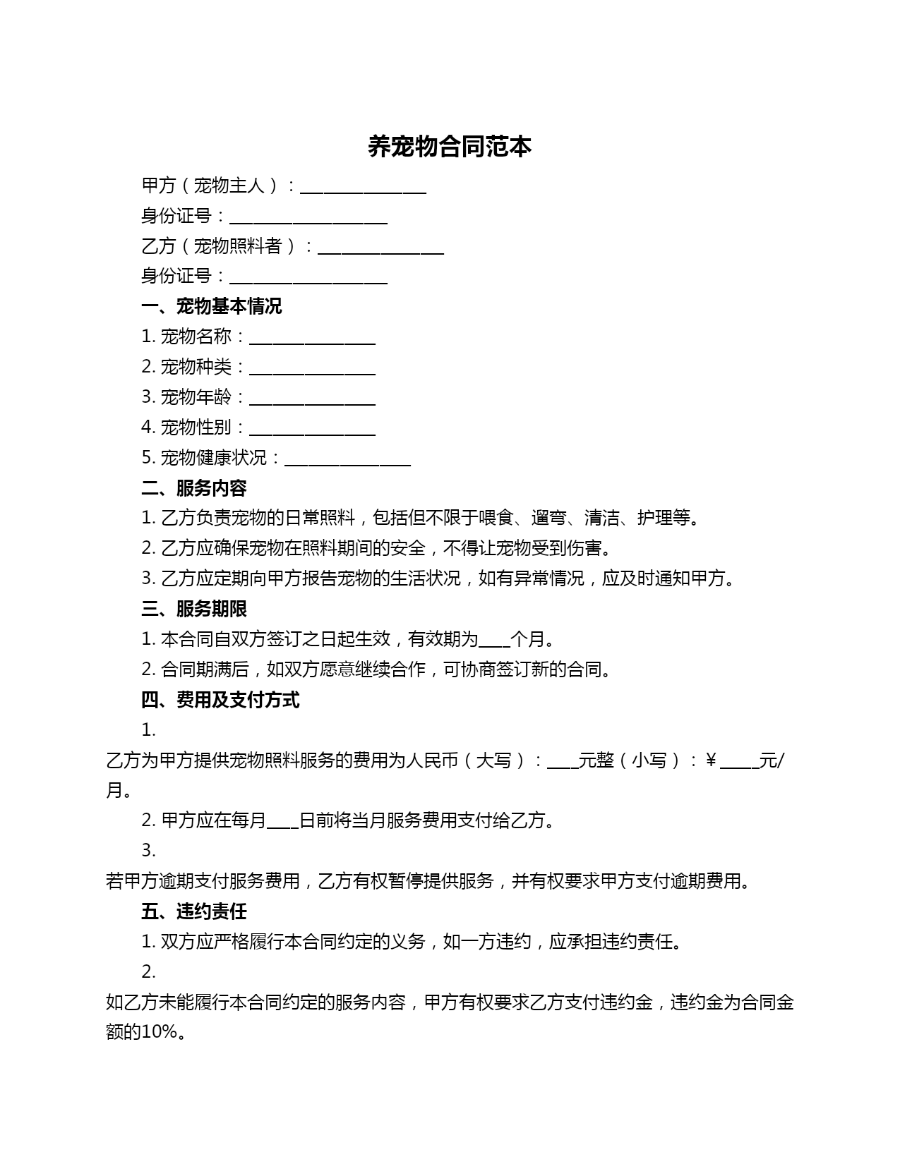 养宠物合同范本甲方(宠物主人):________________身份证号:____________________乙方(宠物照料者):________________身份证号:____________________一、宠物基本情况1.宠物名称:________________2.宠物种类:________________3.宠物年龄:________________4.宠物性别:________________5.宠物健康状况:________________二、服务内容1.乙方负责宠物的日常照料,包括