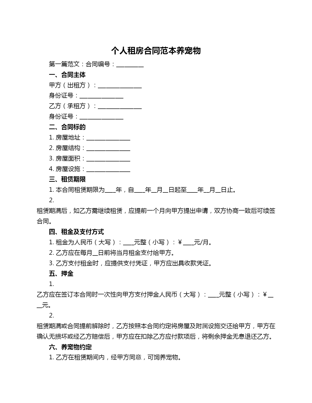 个人租房合同范本养宠物第一篇范文:合同编号:__________一、合同主体甲方(出租方):________________身份证号:________________乙方(承租方):________________身份证号:________________二、合同标的1.房屋地址:________________2.房屋结构:________________3.房屋面积:________________4.房屋设施:________________三、租赁期限1.本合同租赁期限为____年,自____年_