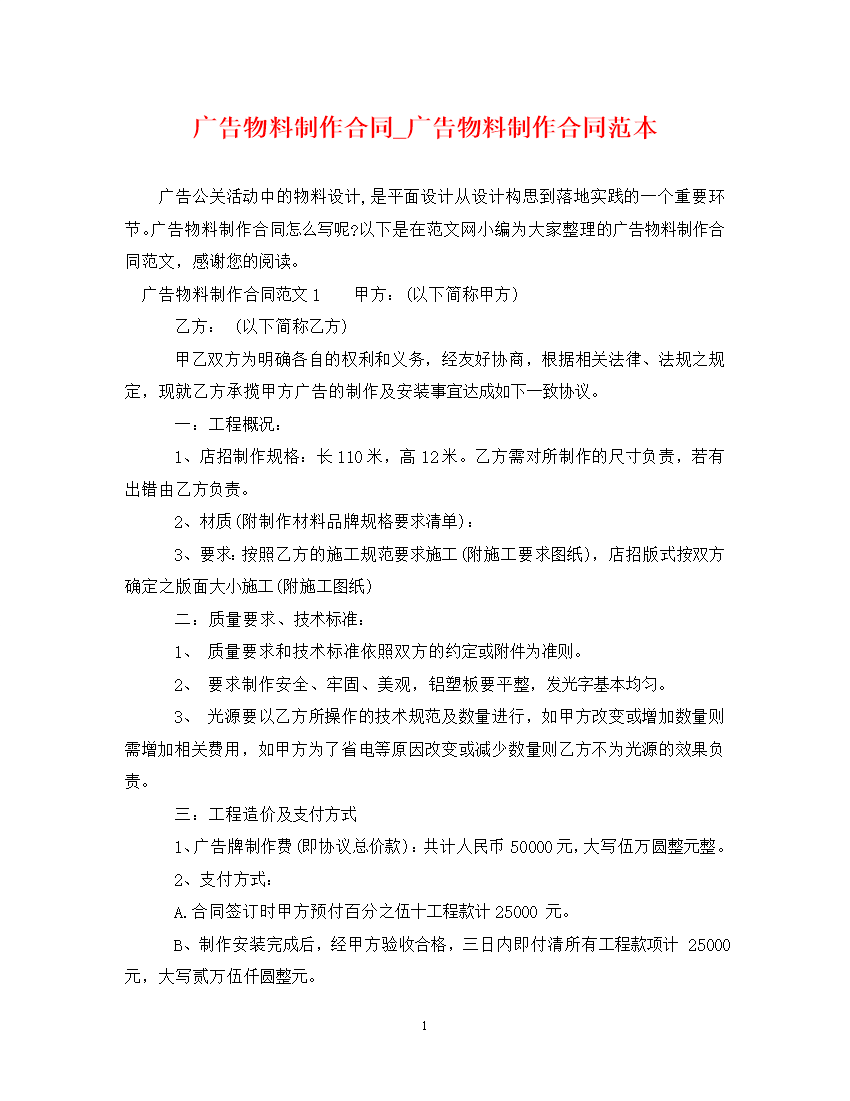 广告物料制作合同_广告物料制作合同范本广告物料制作合同范文1甲方:(以下简称甲方)乙方:(以下简称乙方)甲乙双方为明确各自的权利和义务,经友好协商,根据相关法律、法规之规定,现就乙方承揽甲方广告的制作及安装事宜达成如下一致协议。一:工程概况:1、店招制作规格:长110米,高12米。乙方需对所制作的尺寸负责,若有出错由乙方负责。2、材质(附制作材料品牌规格要求清单):3、要求:按照乙方的施工规范要求施工(附施工要求图纸),店招版式按双方确定之版面大小施工(附施工图纸)二:质量要求、技术标准:1、质量要求和技