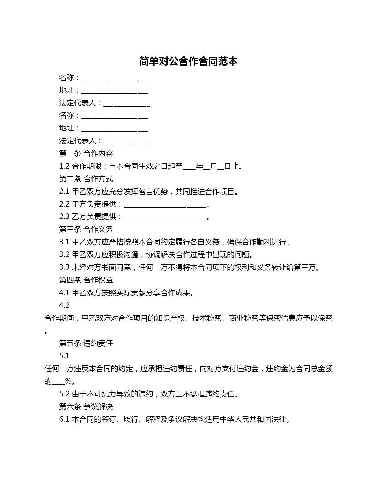 简单对公合作合同范本.doc