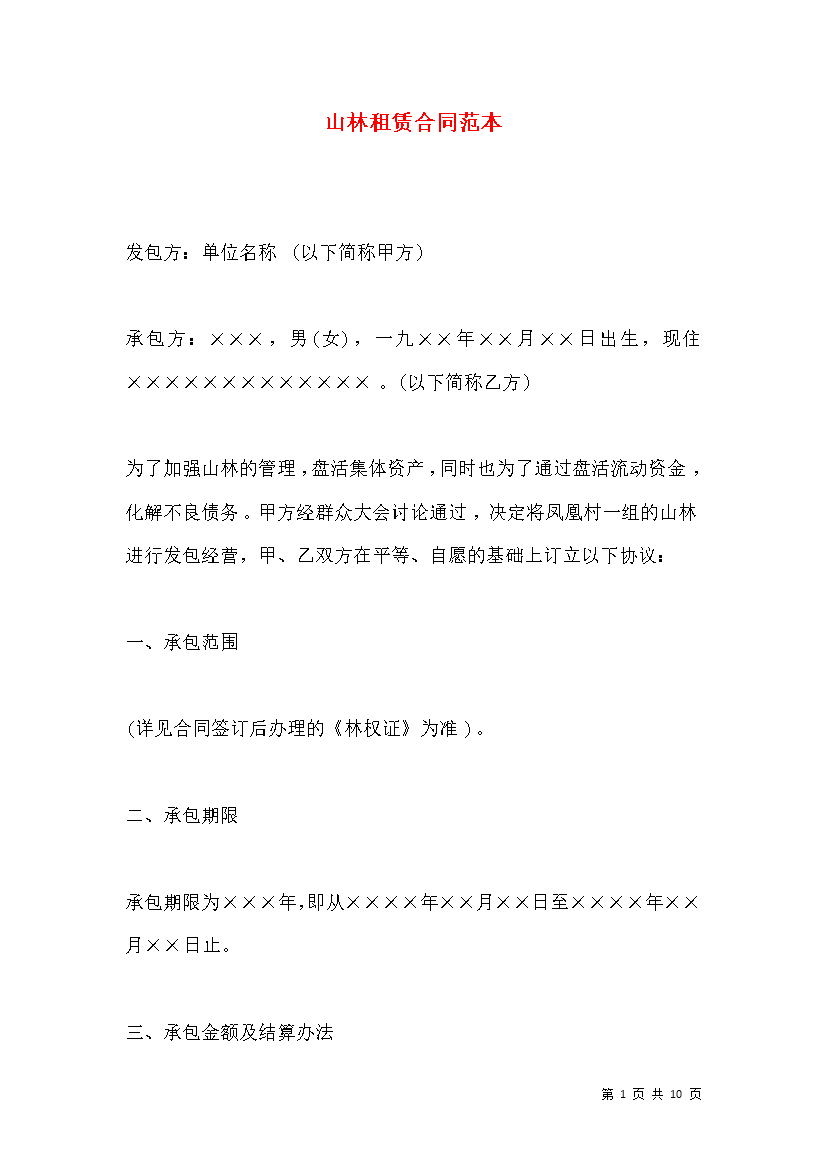 山林租赁合同范本发包方:__________________单位名称(以下简称甲方)承包方:_________,男(女),______年______月______日出生,现住_______________________________________。(以下简称乙方)为了加强山林的管理,盘活集体资产,同时也为了通过盘活流动资金,化解不良债务。甲方经群众大会讨论通过,决定将__________________的山林进行发包经营,甲、乙双方在平等、自愿的基础上订立以下协议:一、承包范围(详见合同签订后办理的