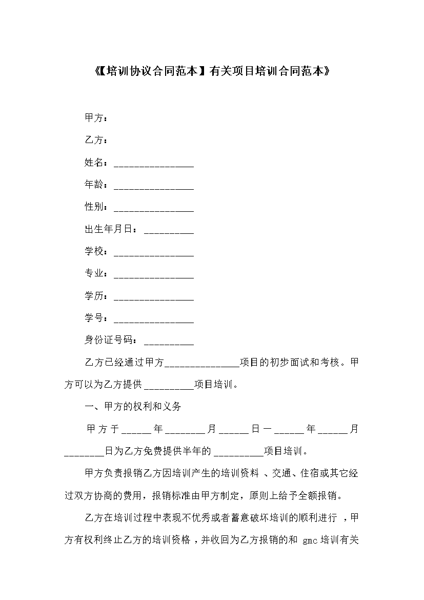 《【培训协议合同范本】有关项目培训合同范本》甲方:乙方:姓名:________________年龄:________________性别:________________出生年月日:__________学校:________________专业:________________学历:________________学号:________________身份证号码:__________乙方已经通过甲方_______________项目的初步面试和考核。甲方可以为乙方提供_______