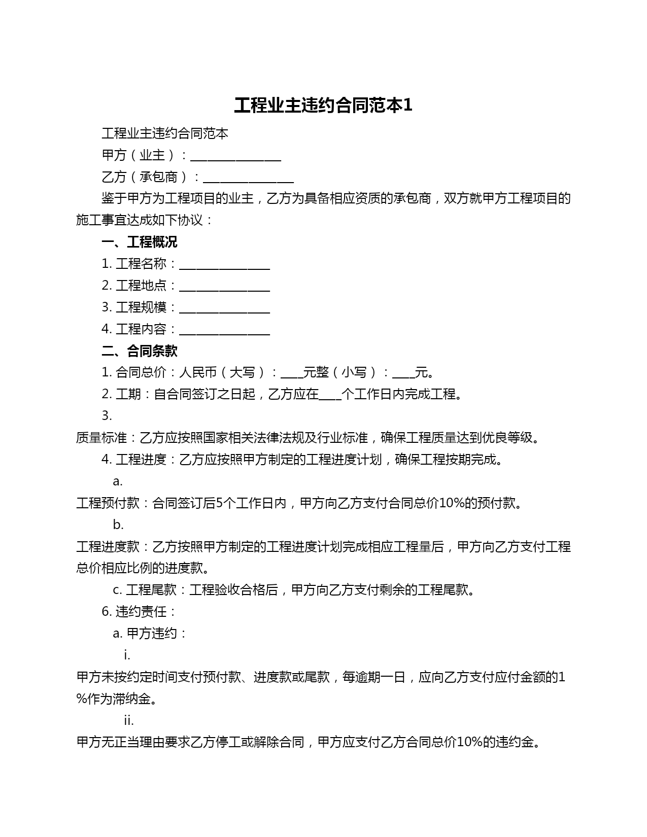 工程业主违约合同范本1工程业主违约合同范本甲方(业主):________________乙方(承包商):________________鉴于甲方为工程项目的业主,乙方为具备相应资质的承包商,双方就甲方工程项目的施工事宜达成如下协议:一、工程概况1.工程名称:________________2.工程地点:________________3.工程规模:________________4.工程内容:________________二、合同条款1.合同总价:人民币(大写):____元整(小写):____元。2.工
