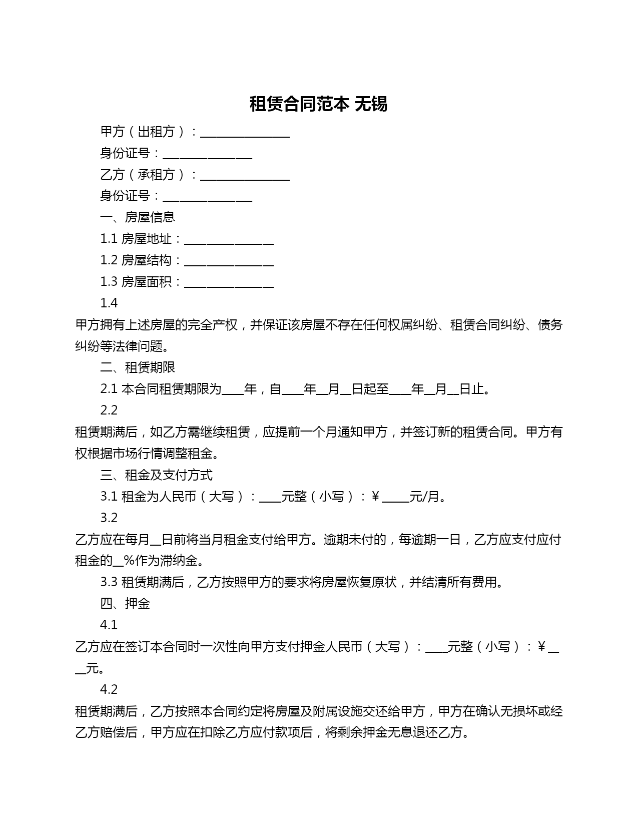 租赁合同范本无锡甲方(出租方):________________身份证号:________________乙方(承租方):________________身份证号:________________一、房屋信息1.1房屋地址:________________1.2房屋结构:________________1.3房屋面积:________________1.4甲方拥有上述房屋的完全产权,并保证该房屋不存在任何权属纠纷、租赁合同纠纷、债务纠纷等法律问题。二、租赁期限2.1本合同租赁期限为____年,自____年