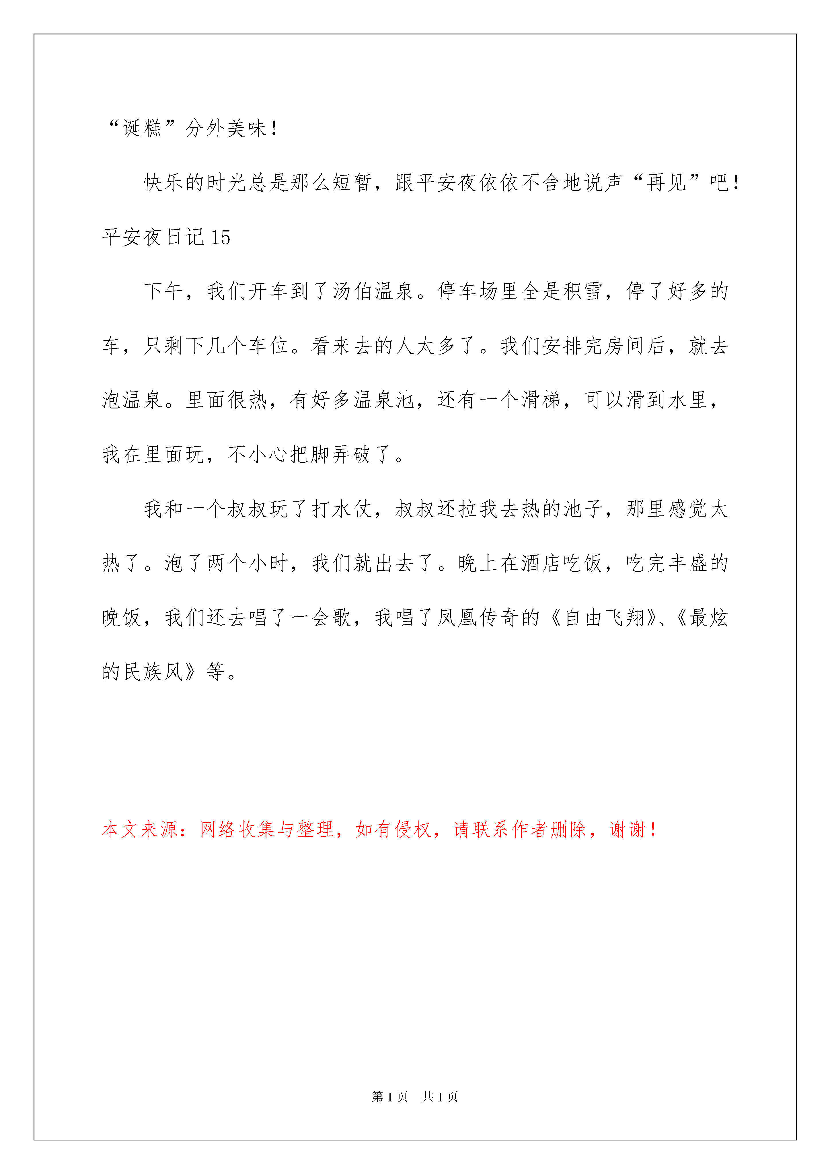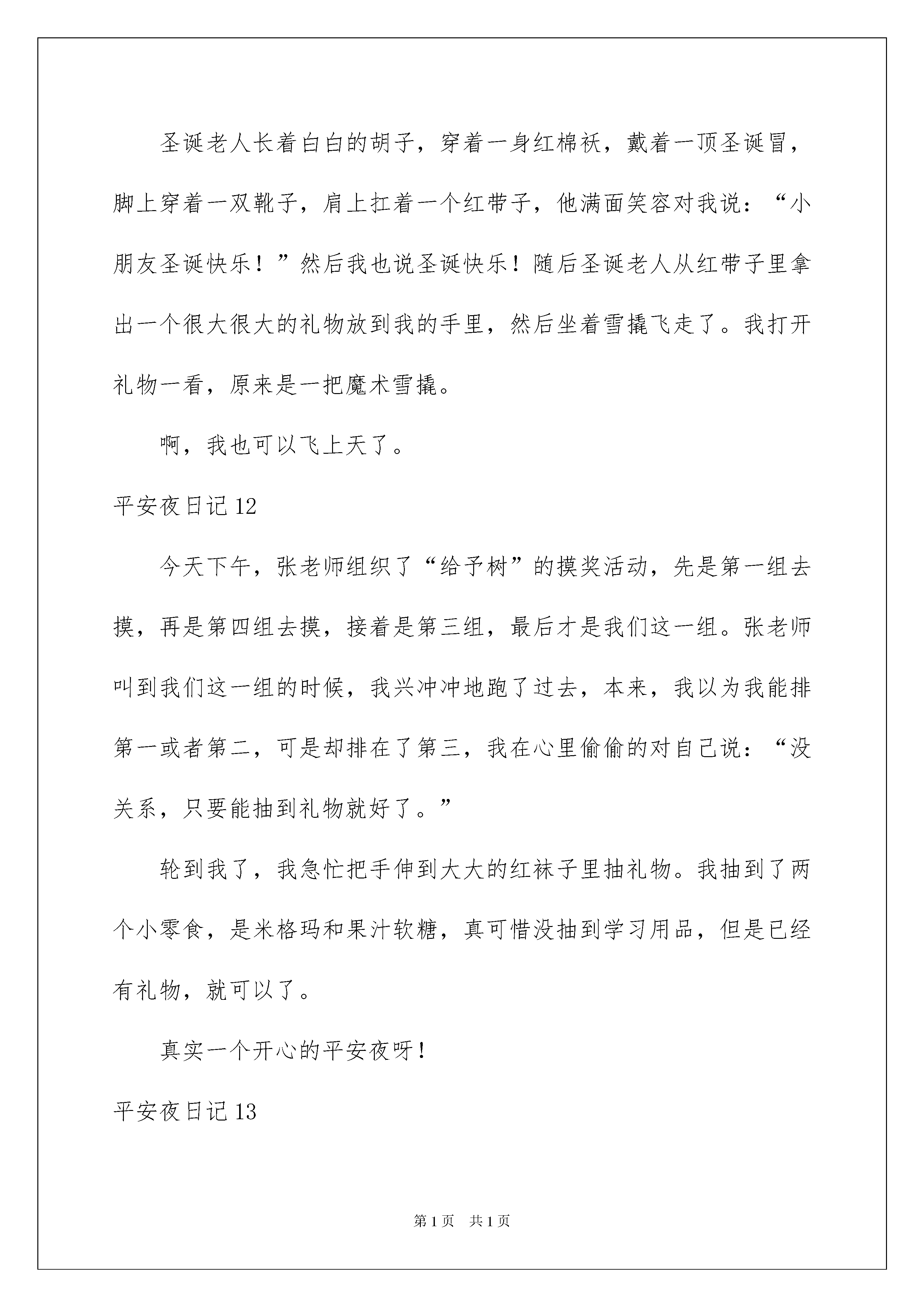 2022平安夜日记(合集15篇)平安夜日记一天又结束了,相信你有很多感悟吧,这时候十分有必须要写一篇日记了。那么什么样的日记才合适呢?以下是我精心整理的平安夜日记,仅供参考,欢迎大家阅读。平安夜日记120xx年X月X日晴今年的平安夜,我和妈妈提前准备了一棵圣诞树,我亲手布置装扮了它!平安夜那天,因为是周一,我做完作业后,关了电灯,点上蜡烛灯,圣诞树上