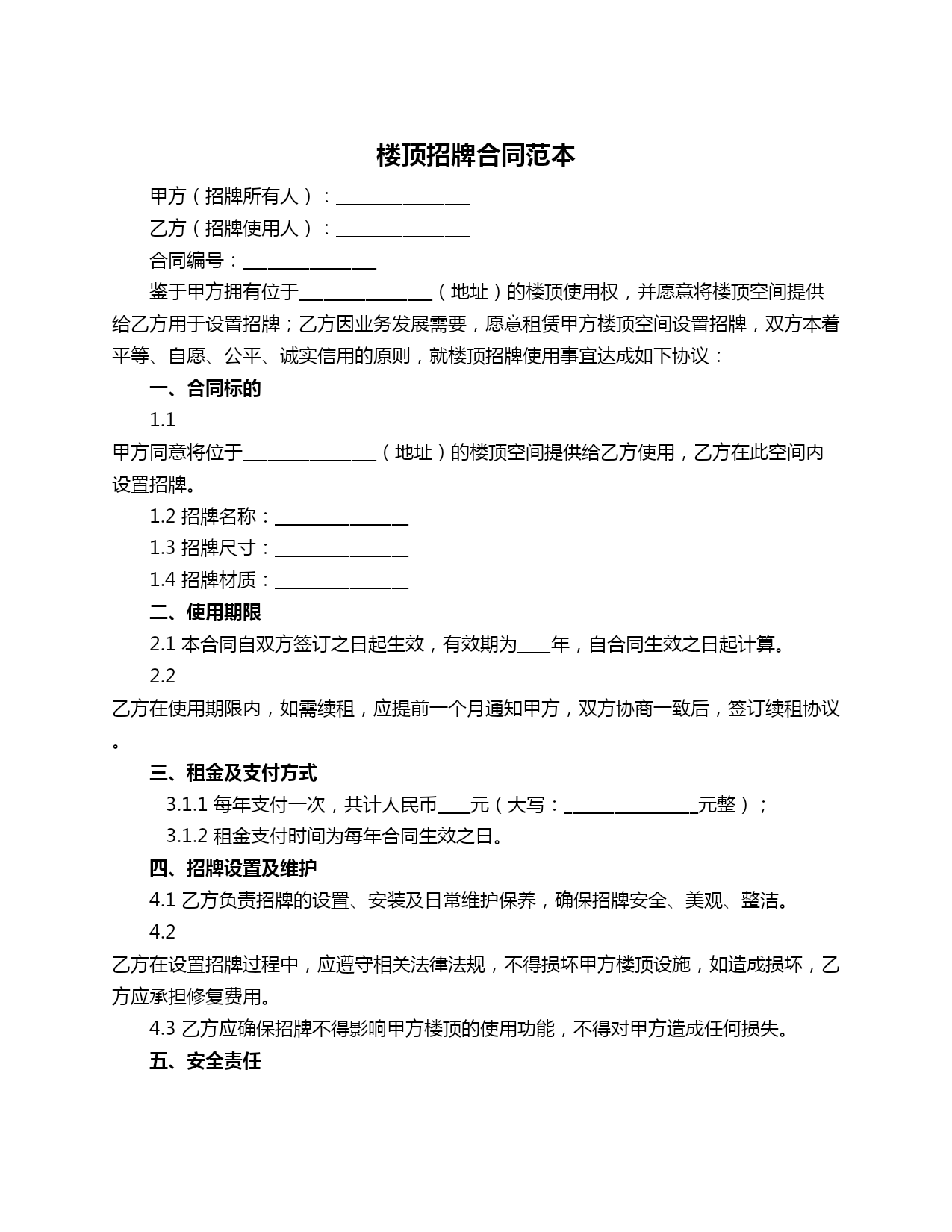 楼顶招牌合同范本甲方(招牌所有人):________________乙方(招牌使用人):________________合同编号:________________鉴于甲方拥有位于________________(地址)的楼顶使用权,并愿意将楼顶空间提供给乙方用于设置招牌;乙方因业务发展需要,愿意租赁甲方楼顶空间设置招牌,双方本着平等、自愿、公平、诚实信用的原则,就楼顶招牌使用事宜达成如下协议:一、合同标的1.1甲方同意将位于________________(地址)的楼顶空间提供给乙方使用,乙方在此空间内设