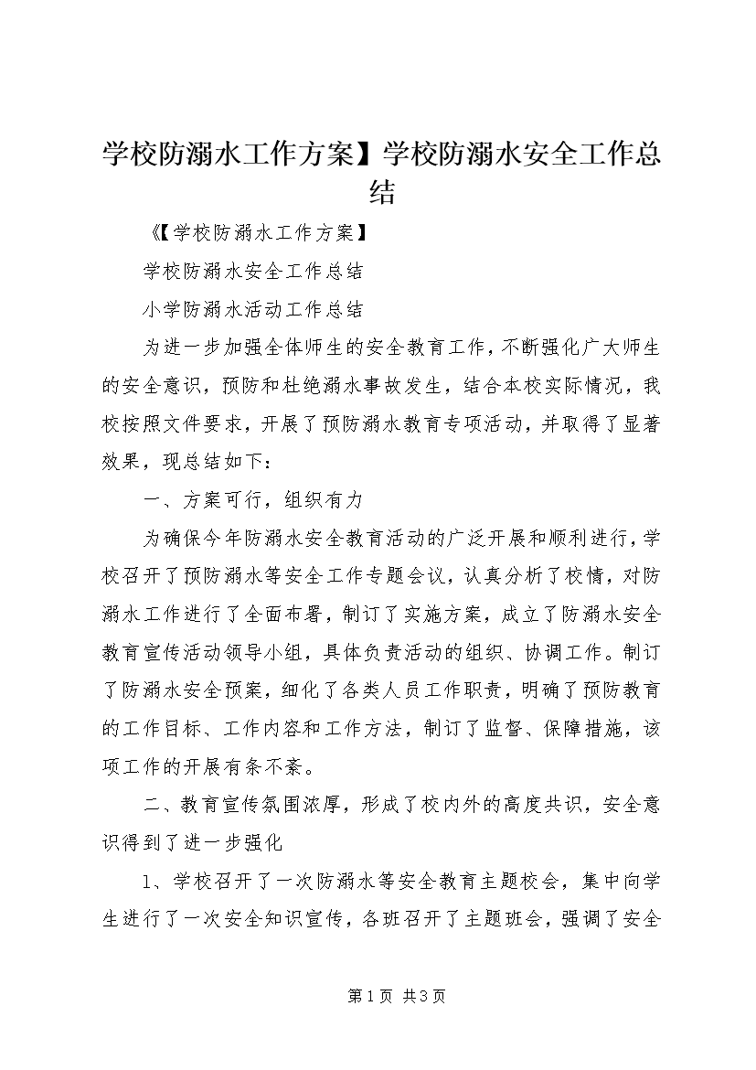 学校防溺水工作方案】学校防溺水安全工作总结《【学校防溺水工作方案】学校防溺水安全工作总结小学防溺水活动工作总结为进一步加强全体师生的安全教育工作,不断强化广大师生的安全意识,预防和杜绝溺水事故发生,结合本校实际情况,我校按照文件要求,开展了预防溺水教育专项活动,并取得了显著效果,现总结如下:一、方案可行,组织有力为确保今年防溺水安全教育活动的广泛开展和顺利进行,学校召开了预防溺水等安全工作专题会议,认真分析了校情,对防溺水工作进行了全面布署,制订了实施方案,成立了防溺水安全教育宣传活动领导小组,具体负责活