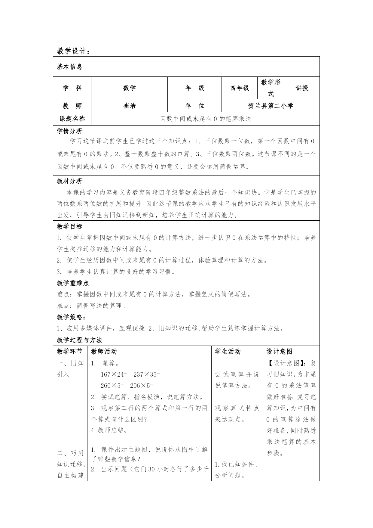 教学设计:基本信息学科数学年级四年级教学形式讲授教师崔洁单位贺兰县第二小学课题名称因数中间或末尾有0的笔算乘法学情分析学习这节课之前学生已学过这三个知识点:1、三位数乘一位数,第一个因数中间有0或末尾有0的乘法。2、整十数乘整十数的口算。3、三位数乘两位数。这节课不同的是一个因数中间或末尾有0。不仅要熟悉0的意义,还要会运用简便运算。教材分析本课的学习内容是义务教育阶段四年级整数乘法的最后一个知识块。它是学生已掌握的两位数乘两位数的扩展和提升。因此这节课的教学应从学生已有的知识经验和认识发展水平出发,引导