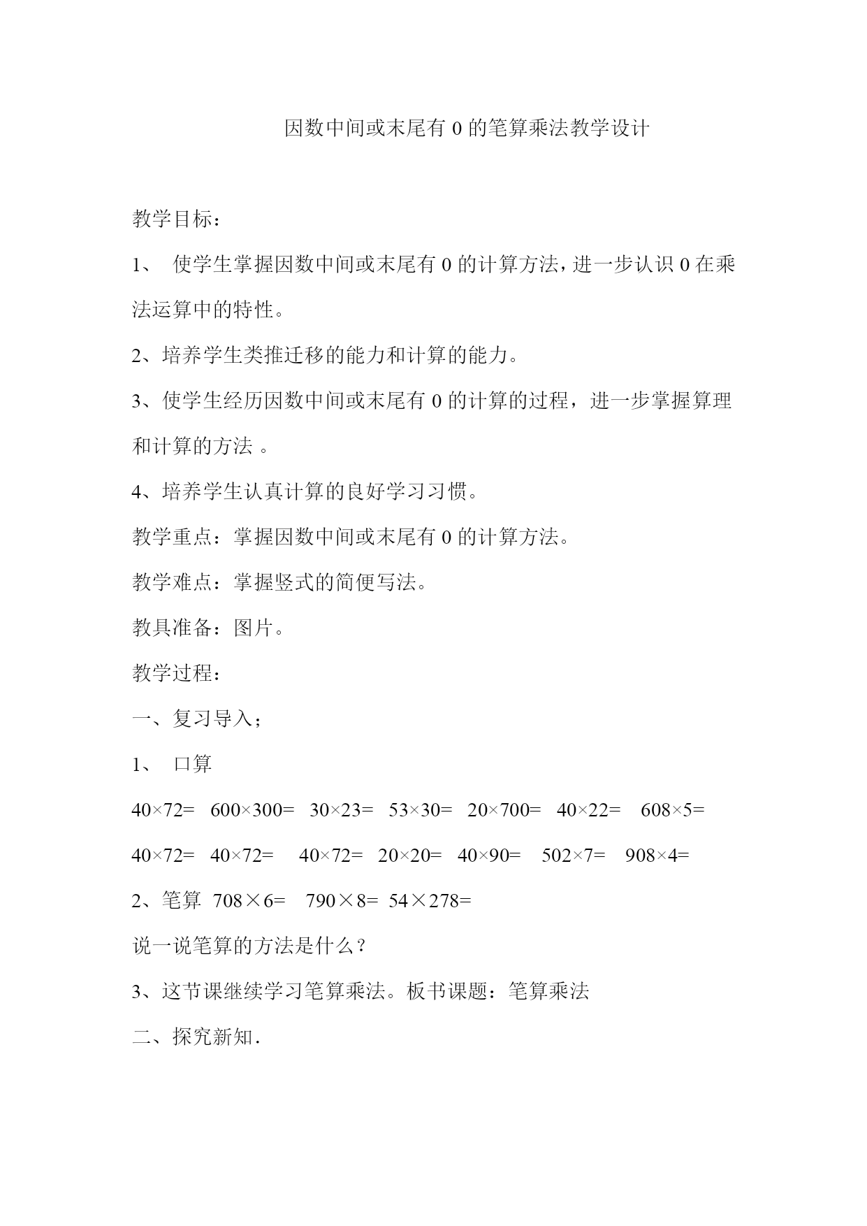 因数中间或末尾有0的笔算乘法教学设计教学目标:1、使学生掌握因数中间或末尾有0的计算方法,进一步认识0在乘法运算中的特性。2、培养学生类推迁移的能力和计算的能力。3、使学生经历因数中间或末尾有0的计算的过程,进一步掌握算理和计算的方法。4、培养学生认真计算的良好学习习惯。教学重点:掌握因数中间或末尾有0的计算方法。教学难点:掌握竖式的简便写法。教具准备:图片。教学过程:一、复习导入;1、口算40×72=600×300=30×23=53×30=20×700=40×22=608×5=40×72=40×72=4