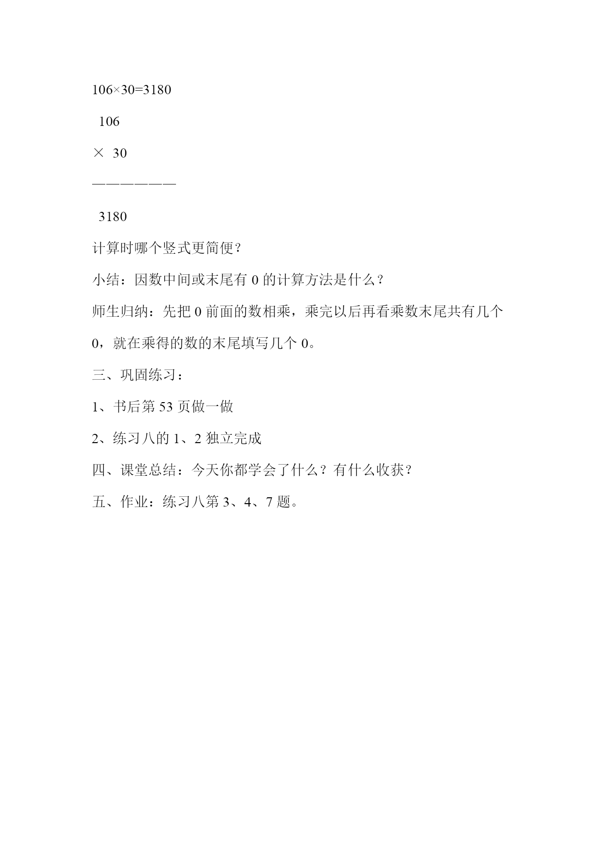笔算乘法(因数中间或末尾有0的乘法)教案教学内容:教材53页内容及相关的练习教学目标:1、通过教学三位数乘两位数的特殊笔算—因数中间或末尾有零的乘法,使学生进一步认识“0”在乘法运算中的特性。2、使学生能够运用合适的方法计算,鼓励算法多样化。教材分析:教材以本单元的主题图中特快列车和普通列车的运行为题材,引入中间或末尾有零的三位数乘整十数的乘法。一方面使学生体会计算因解决问题的需要而产生,另一方面为学生理解“速度”概念以及理解速度、时间和路程之间的关系作又一次铺垫。学情分析:学生已经学习了三位数乘一位数的